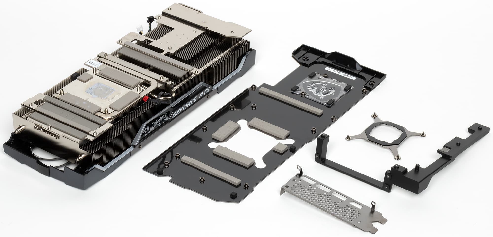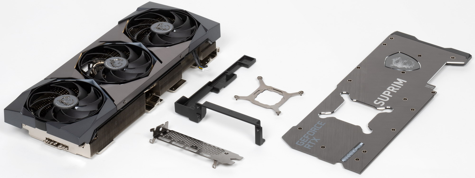 В Nvidia решили сделать у карт GeForce RTX 3080/3090 более компактную PCB и придумали новую систему охлаждения, продувающую радиатор насквозь (при этом частично оставляющую нагретый воздух в объеме корпуса). Однако в MSI предпочли пойти старым проверенным путем, сделав PCB длиннее и установив кулер привычной конструкции. Поэтому перед нами огромный двухсекционный пластинчатый никелированный радиатор с тепловыми трубками, припаянными к никелированной подошве, контактирующей с GPU. Форма ребер и концевые направляющие помогают рассеивать потоки нагретого воздуха.