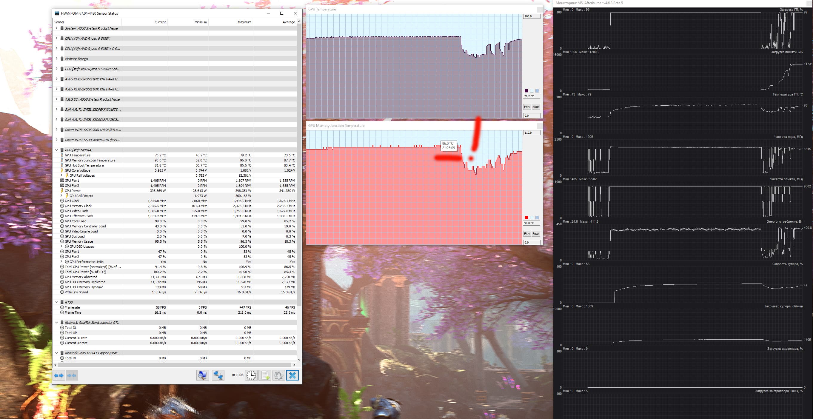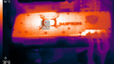 В этом случае максимальная температура ядра достигала 79 градусов, а микросхем памяти — 96 °C, что, в принципе, является приемлемым результатом для видеокарт такого уровня. Энергопотребление карты практически не изменилось (403 Вт).