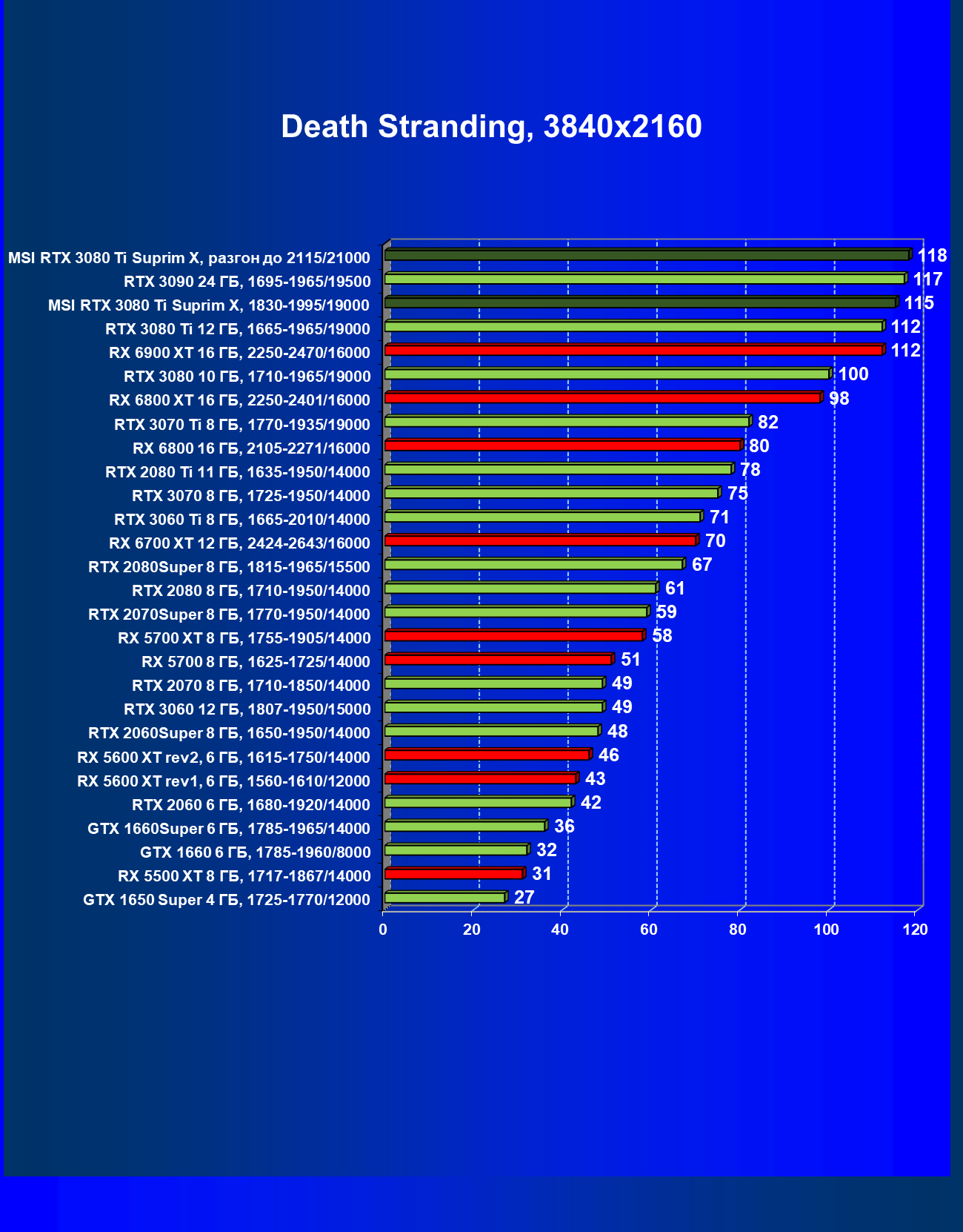| 13 | MSI RTX 3080 Ti Suprim X, 1830—1995/19000 | 48 | 948 | 196 000 |