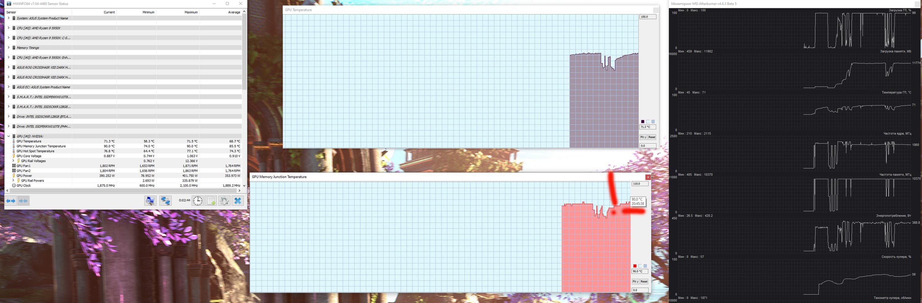 После 2-часового прогона под нагрузкой максимальная температура ядра не превысила 71 градуса по ядру и 90 градусов на микросхемах памяти, что является очень неплохим результатом для видеокарт флагманского уровня. Энергопотребление карты доходило до 403 Вт. Напомним, что безопасный предел нагрева памяти GDDR6X — 105 °C.