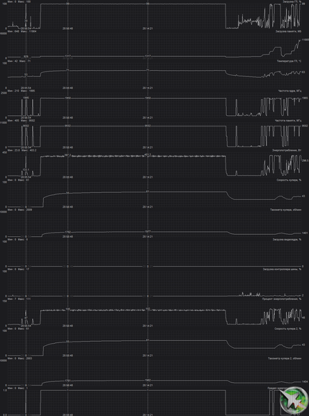 В режиме максимальной нагрузки в 3D температура достигала 71/90 °C (ядро/память). Вентиляторы при этом раскручивались до 1850 оборотов в минуту, шум вырастал до 32,6 дБА: это отчетливо слышно. В видеоролике ниже можно оценить, как вырастает шум (он фиксировался на пару секунд через каждые 30 секунд).