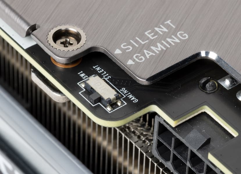 Карта имеет два режима работы, они заложены в двух вариантах BIOS, которые переключаются на верхнем торце карты: Gaming и Silent. Разница между режимами заключается лишь в оборотах вентиляторов, а Boost-частоты GPU и частоты памяти одинаковые.