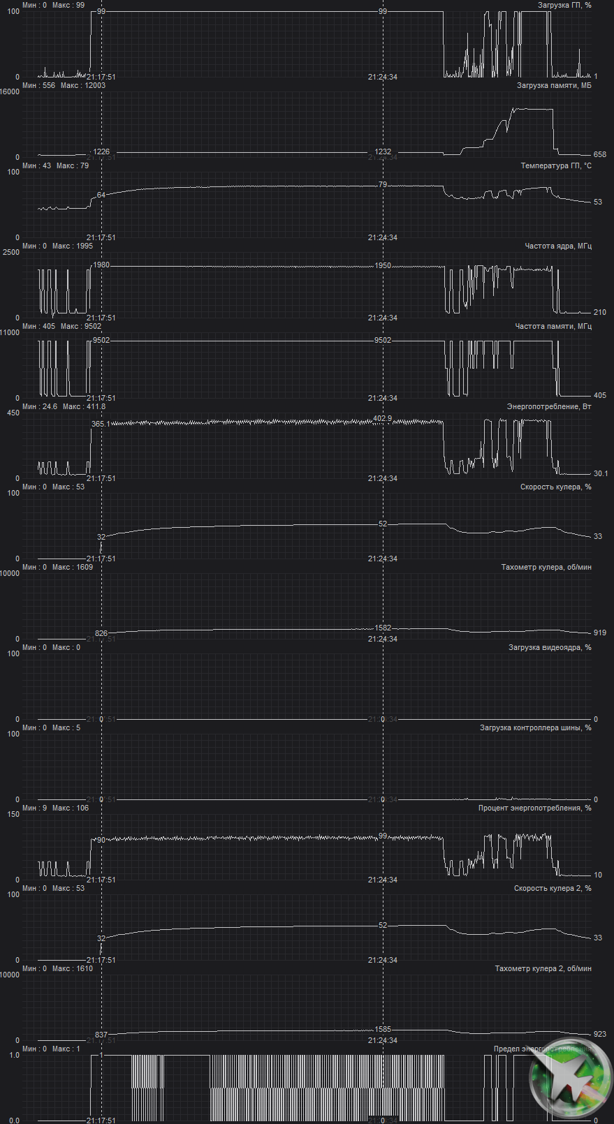 В режиме максимальной нагрузки в 3D температура достигала 79/96 °C (ядро/память). Вентиляторы при этом раскручивались лишь до 1580 оборотов в минуту, шум вырастал до 26,4 дБА: это уже тихо. В видеоролике ниже это продемонстрировано (шум фиксировался на пару секунд через каждые 30 секунд).