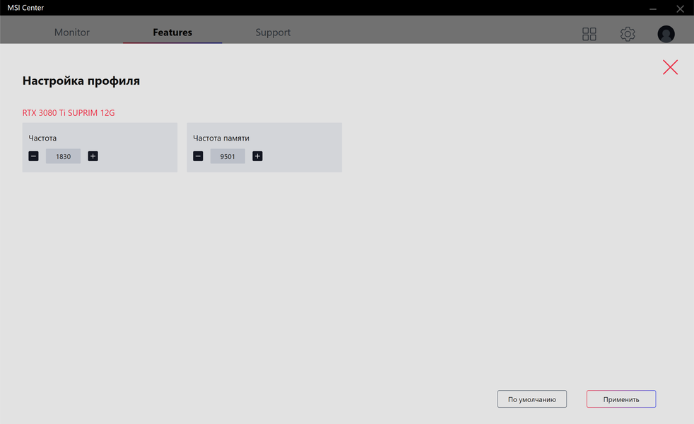 Управление работой карты обеспечивается с помощью фирменной утилиты MSI Center. Эта программа относительно недавно заменила собой прежний Dragon Center и является универсальным средством для огромного ассортимента продуктов MSI, включая не только видеокарты и материнские платы, но также и СЖО и ноутбуки.