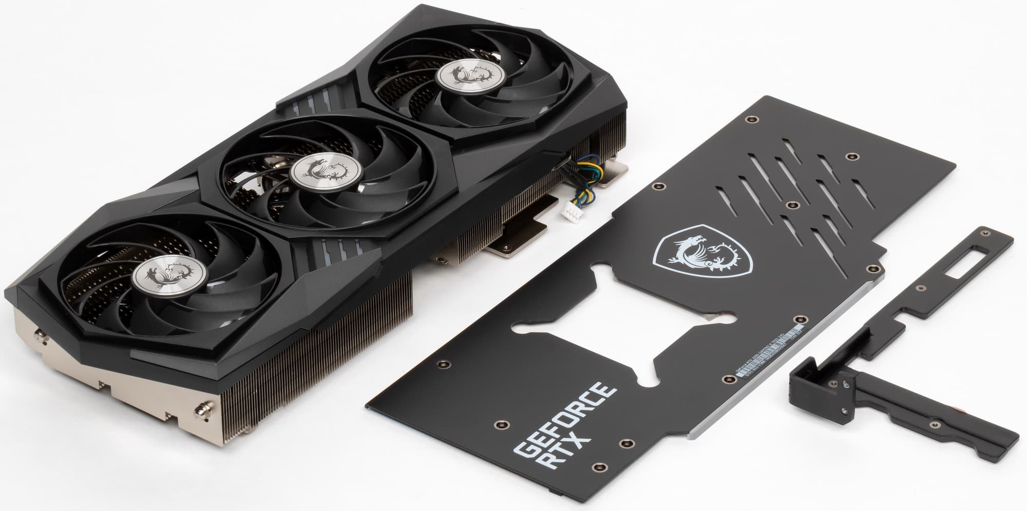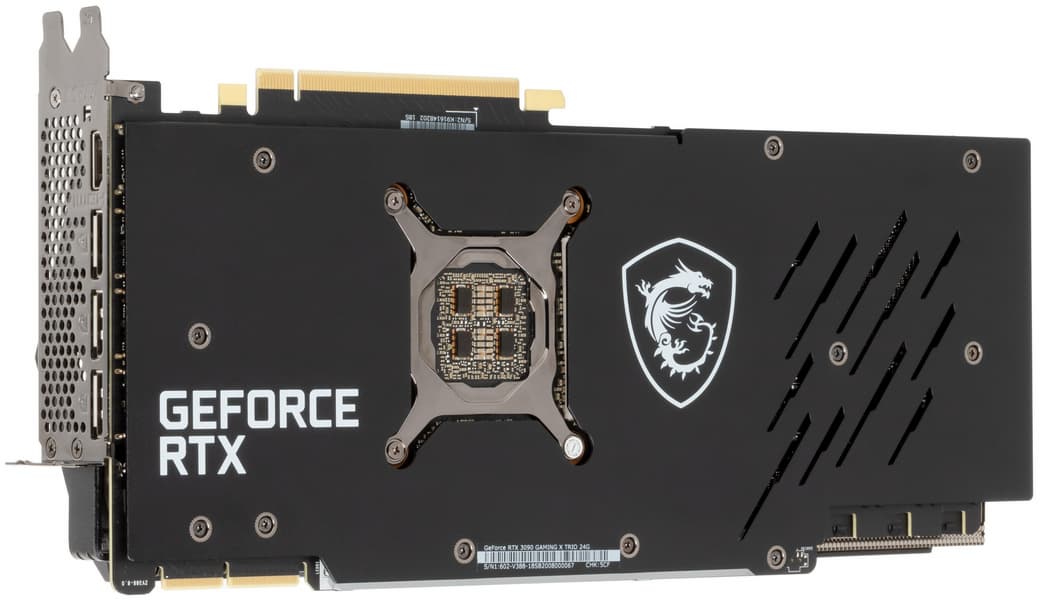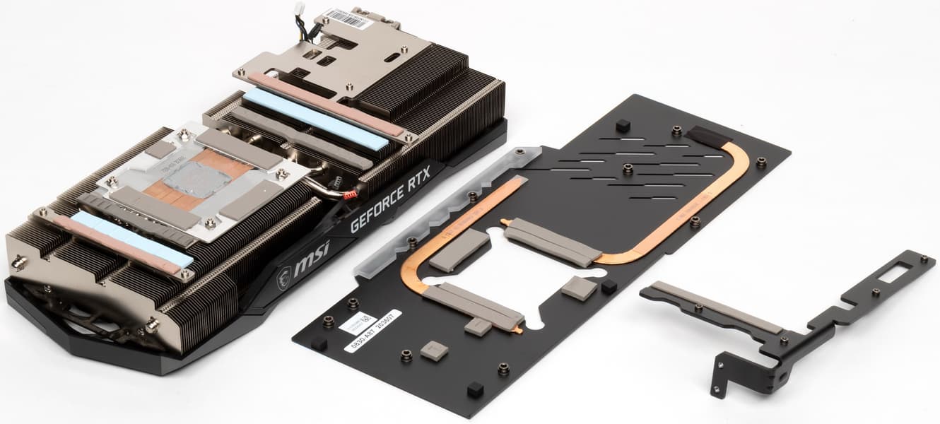 В Nvidia решили сделать у карт GeForce RTX 3080/3090 более компактную PCB и придумали новую систему охлаждения, продувающую радиатор насквозь (при этом частично оставляющую нагретый воздух в объеме корпуса). Однако в MSI решили пойти старым проверенным путем, сделав PCB длиннее и установив кулер привычной конструкции. Поэтому перед нами огромный двухсекционный пластинчатый никелированный радиатор с тепловыми трубками, формирующими подошву прямого контакта с GPU. Микросхемы памяти охлаждаются пластиной, прикрученной к основанию радиатора, а преобразователи питания VRM охлаждаются с помощью отдельных подошв на том же радиаторе (одна из этих пластин служит еще и ребром жесткости). Задняя пластина служит не только элементом защиты PCB, но и участвует в охлаждении оборотной стороны платы через термоинтерфейс. Следует отметить, что из-за возросшей площади кристалла GPU стали применять «четырехлапый» прижим-амортизатор, который помогает равномерно распределять прижим подошвы радиатора по всей площади кристалла.