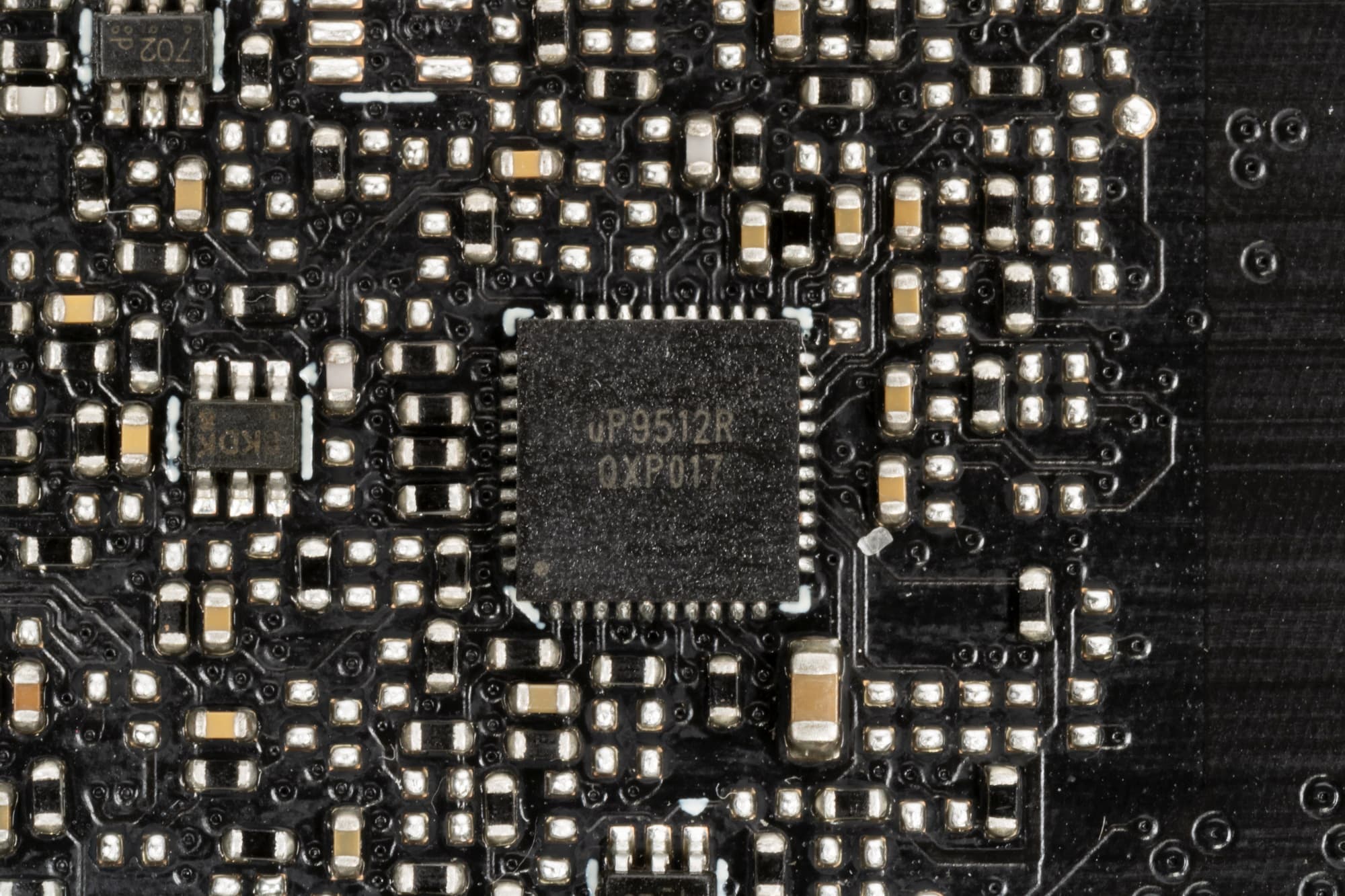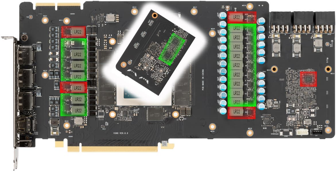 Зеленым цветом отмечена схема питания ядра, красным — памяти. При этом никаких удвоителей (даблеров) фаз нет, для управления схемой питания GPU используются два ШИМ-контроллера uP9512R (uPI Semiconductor), каждый из которых способен управлять 8 фазами максимум. Оба расположены на оборотной стороне платы.