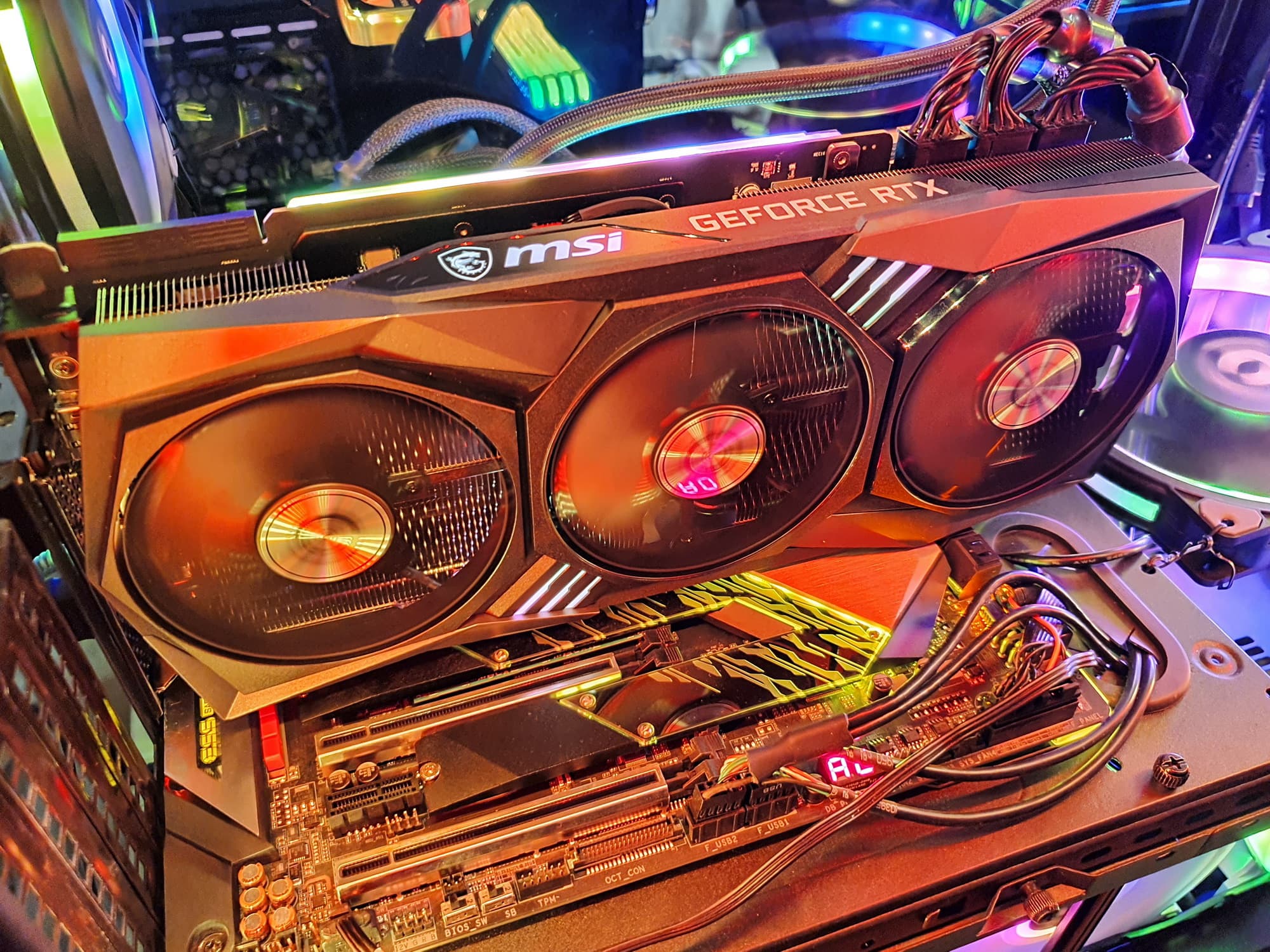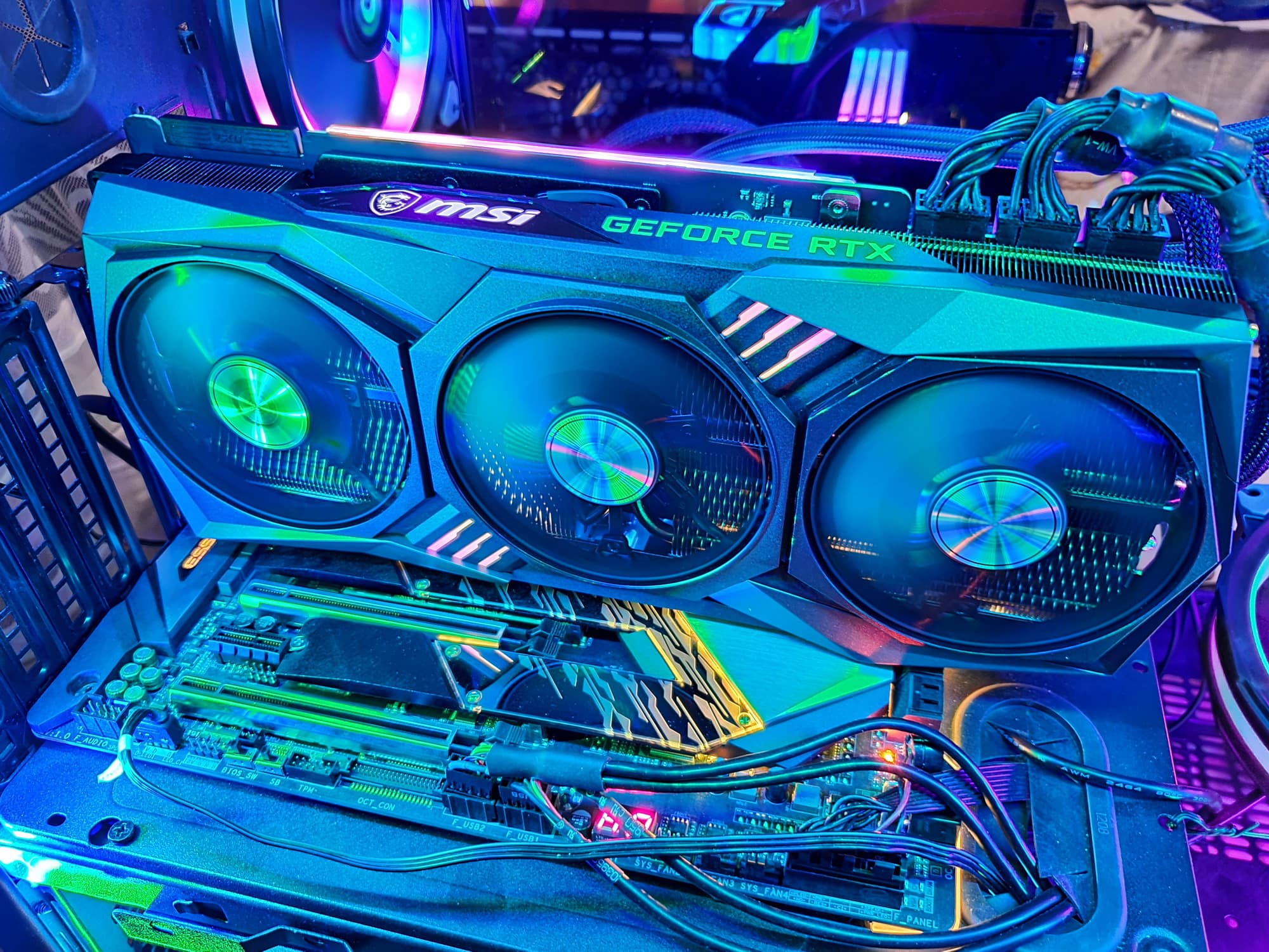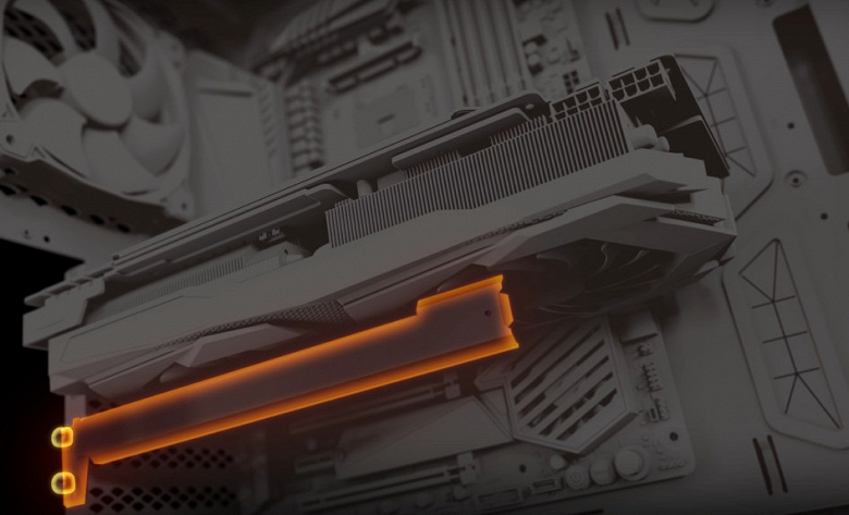 Подсветка у карты реализована в виде горизонтальных полос вдоль верхнего и нижнего торцов карты, также подсвечены вставки между вентиляторами.