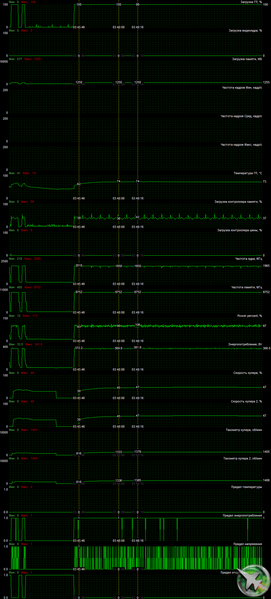 После 6-часового прогона под нагрузкой максимальная температура ядра не превысила 74 градусов, что является приемлемым результатом для видеокарт флагманского уровня. Мониторинг подтвердил, что частота работы GPU с драйверами версии 456.55 поднимается выше 2 ГГц, да и вообще разницы между работой карты с разными версиями драйверов, включая исходную 456.38, нет, все в рамках погрешности измерений. Энергопотребление карты доходило до 382 Вт.