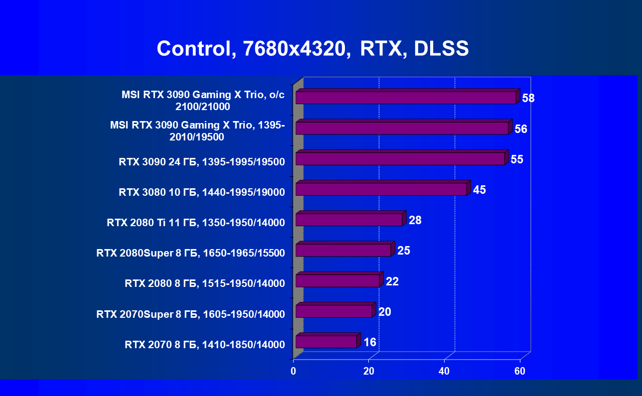 Стоит повторить (хотя в нашем первом материале по GeForce RTX 3090 мы это уже писали), что наличие большого объема памяти и прекрасная производительность дает GeForce RTX 3090 право называться первым видеоускорителем игрового класса для разрешения 8К. Игры должны поддерживать умный антиалиасинг DLSS 2.0 (причем именно для разрешения 4К и выше), тогда комфорт при игре на огромных 8К-телевизорах будет обеспечен при сохранении всех настроек графики по максимуму.