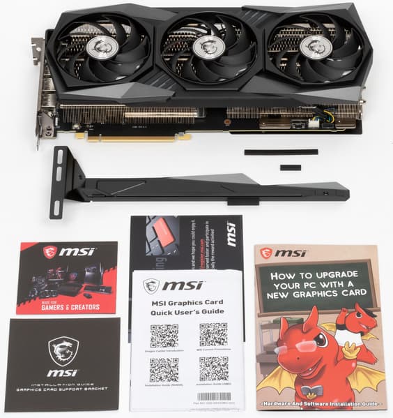 MSI GeForce RTX 3090 Gaming X Trio 24G (24 ГБ) — один из самых длинных, но при этом тихий и не шибко греющийся представитель мощнейшего на сегодня 3D-ускорителя GeForce RTX 3090. Габариты обязательно надо учитывать при выборе карты/корпуса! Карта сама по себе имеет весьма жесткую конструкцию, а еще в комплекте поставки есть кронштейн для ее монтажа. Система охлаждения и так тихая, но на сайте MSI предлагается версия BIOS с работой вентиляторов на еще более низкой частоте вращения (однако и частота работы при этом снижена до референсной). Выделим наличие трех 8-контактных коннекторов питания, что дает меньший нагрев в их области.