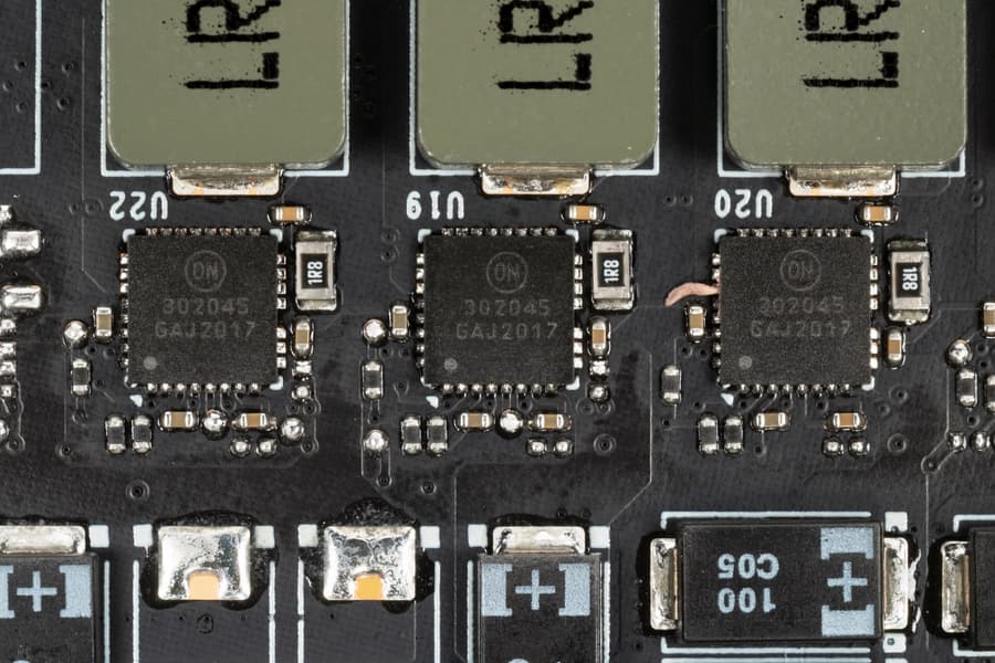 В преобразователе питания, традиционно для всех видеокарт Nvidia, используются транзисторные сборки DrMOS — в данном случае NCP302045 (On Semiconductor), каждая из которых рассчитана максимально на 45 А.