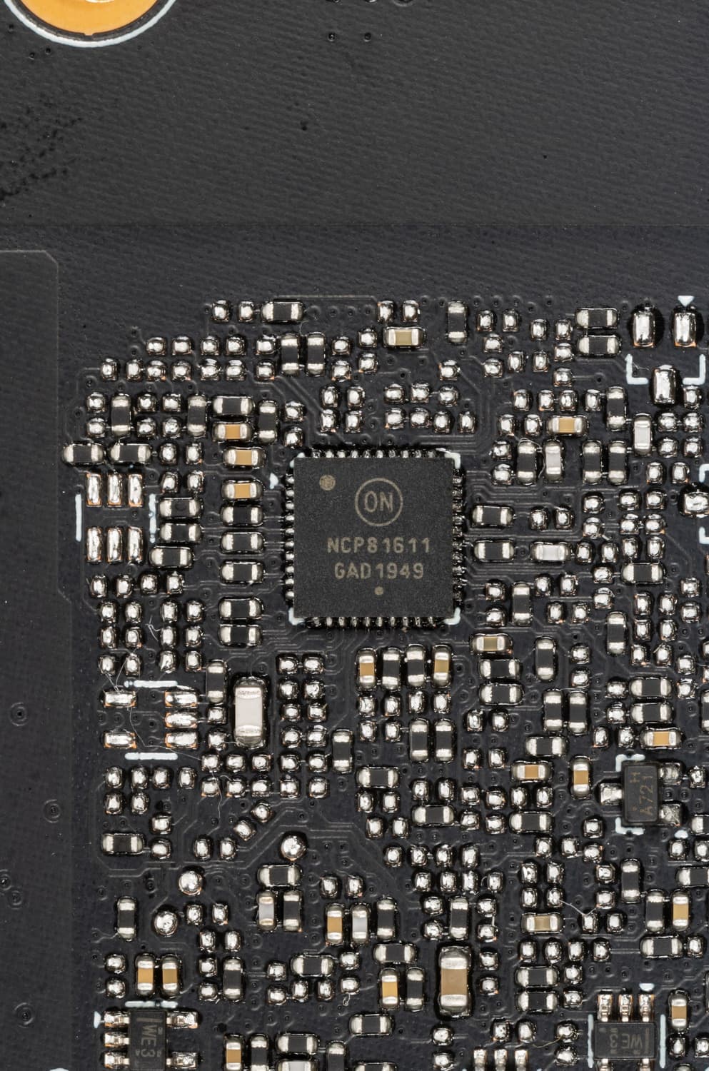 На лицевой же стороне имеется другой ШИМ-контроллер On Semiconductor NCP81611, который управляет 4-фазной схемой питания микросхем памяти.