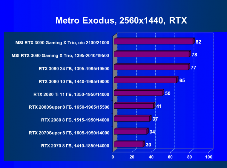 Трудно удивить кого-то информацией, что GeForce RTX 3090 стал лидером по производительности: это было известно изначально :) Разумеется, в лидерах и карта MSI на этом GPU. Ее фабричный разгон обеспечивает некоторый прирост скорости, но совсем уж минимальный, а ручной разгон, из-за ограничения на потребление в драйверах, показал прирост около 4,5%.