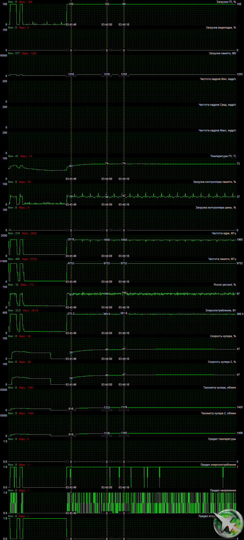 В режиме максимальной нагрузки в 3D температура достигала 74 °C. Вентиляторы при этом раскручивались до 1450 оборотов в минуту, шум вырастал до 26,9 дБА: это тихо. В видеоролике ниже хорошо видно, как шум практически не вырастает (он фиксировался на пару секунд через каждые 30 секунд).