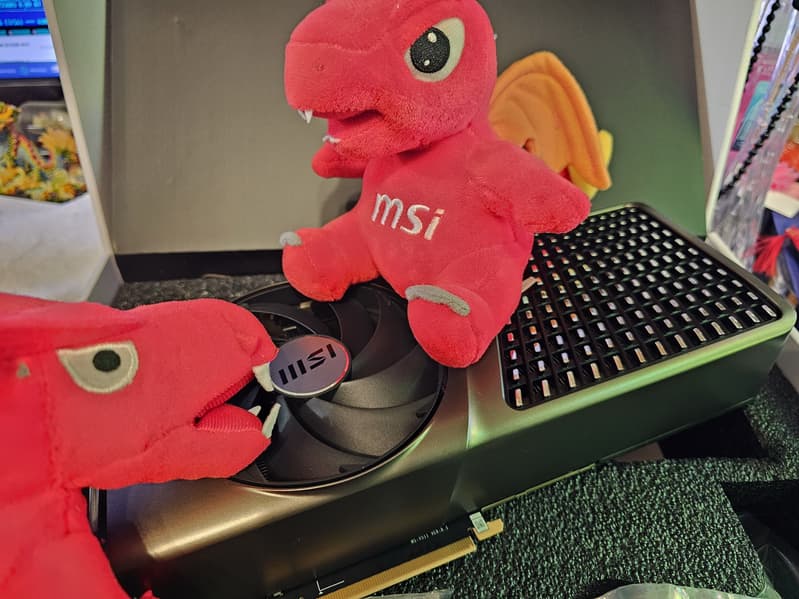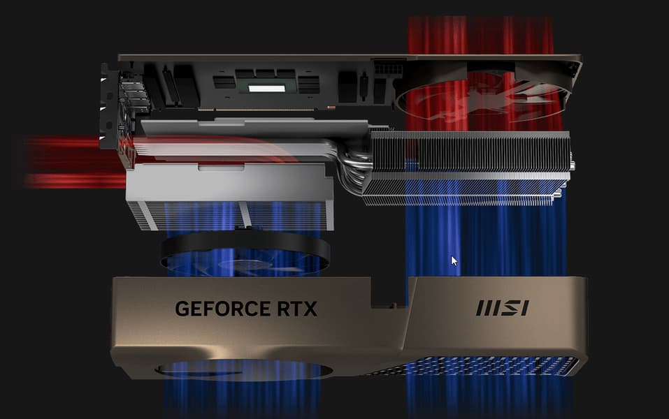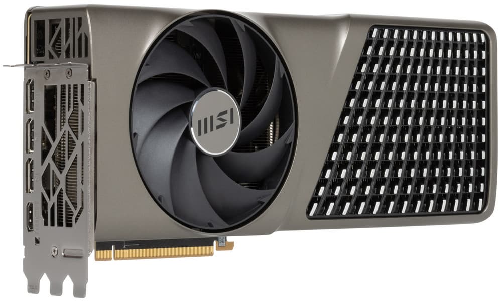 Карта MSI способна потреблять до 300 Вт (разовые всплески могут быть выше). Система охлаждения мощная, эффективная, но достаточно шумная. Габариты видеокарты составляют 31 см в длину и 14 см в высоту, а по толщине она занимает 3 слота в корпусе. Набор видеовыходов — 3 DP 1.4a и 1 HDMI 2.1.