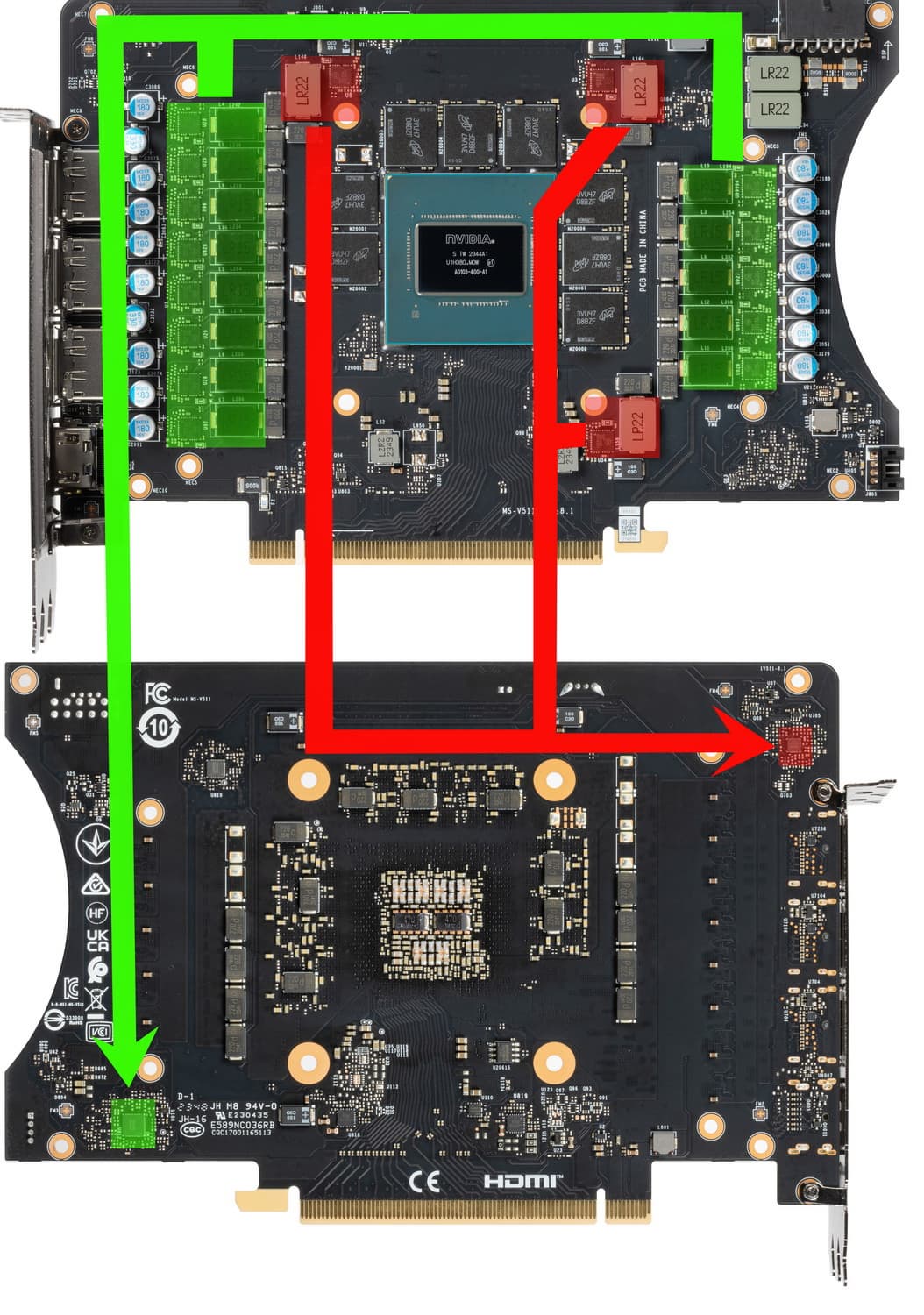Зеленым цветом отмечена схема питания ядра, красным — памяти. Все ШИМ-контроллеры расположены на оборотной стороне PCB.