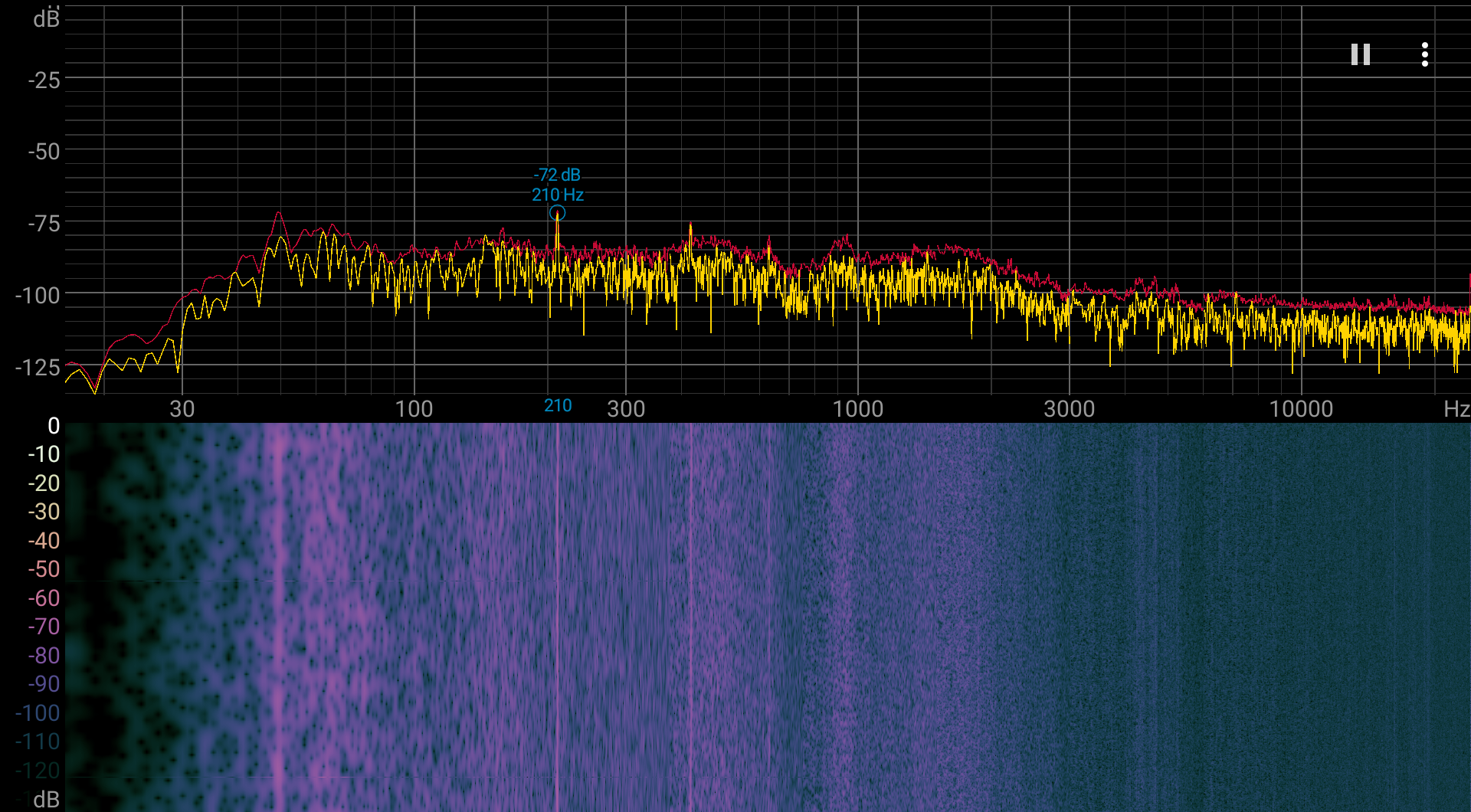 Спектрограмма шума достаточно ровная, но есть пара выраженных пиков на низких частотах Гц.