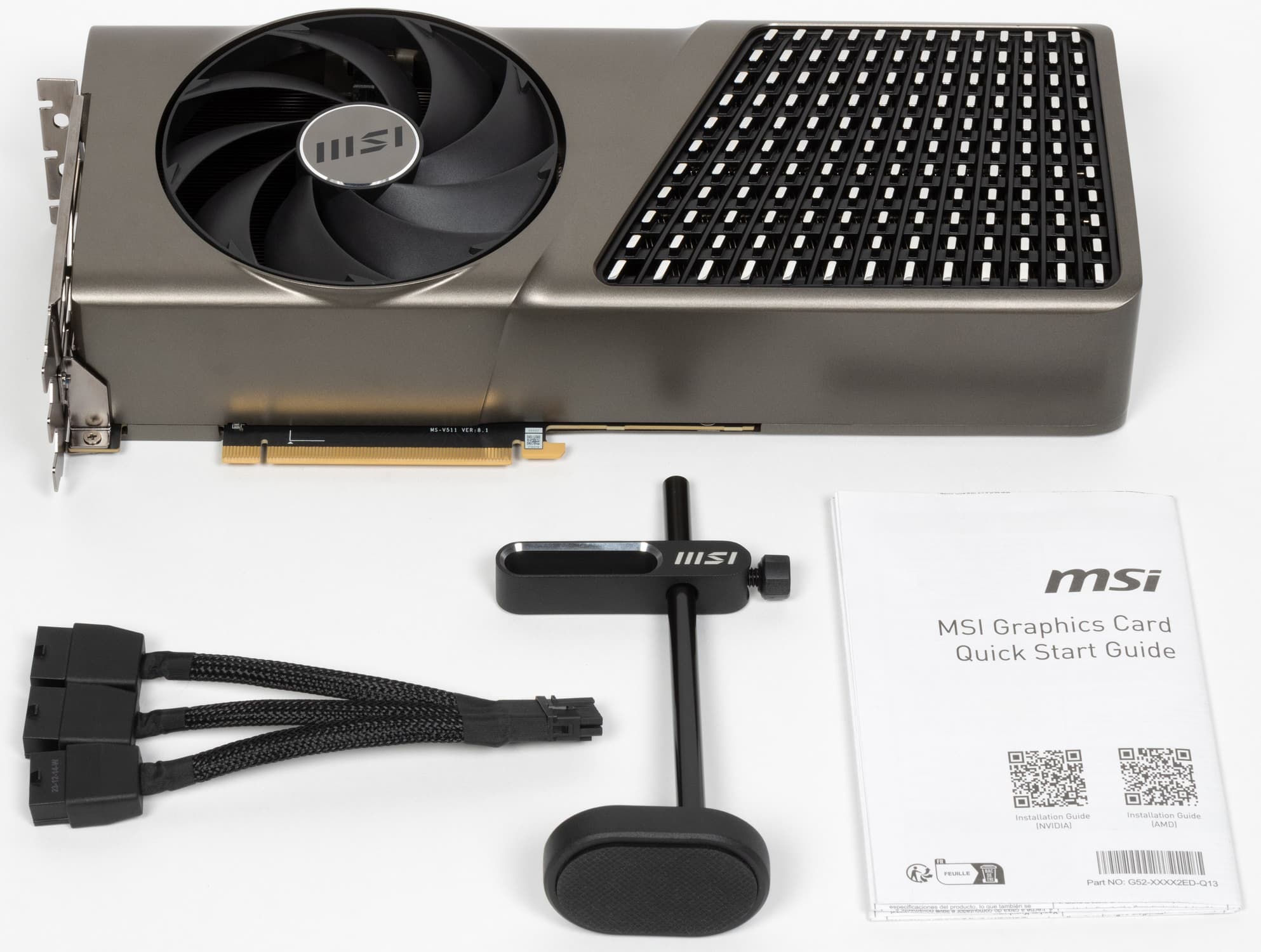 Карта MSI имеет 16-контактный разъем питания версии PCIe 5.0. Хотя в комплекте поставки имеется адаптер-переходник для подключения разъемов питания типа PCIe 2.0 (для 3 таких разъемов), лучше всё же использовать блоки питания стандарта ATX 3.0 с полноценной поддержкой питания PCIe 5.0 (с кабелем 12VHPWR). Имеющийся же переходник питания ни в коем случае нельзя изгибать непосредственно после 16-контактного разъема.