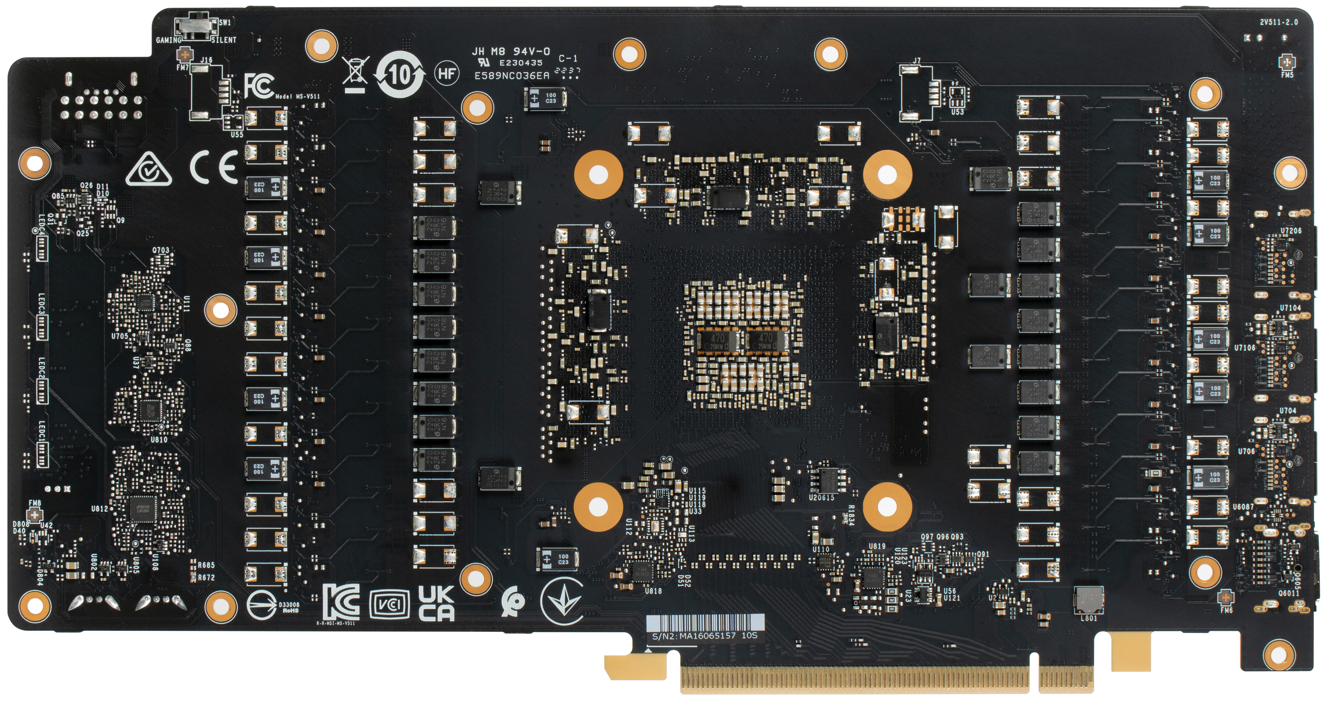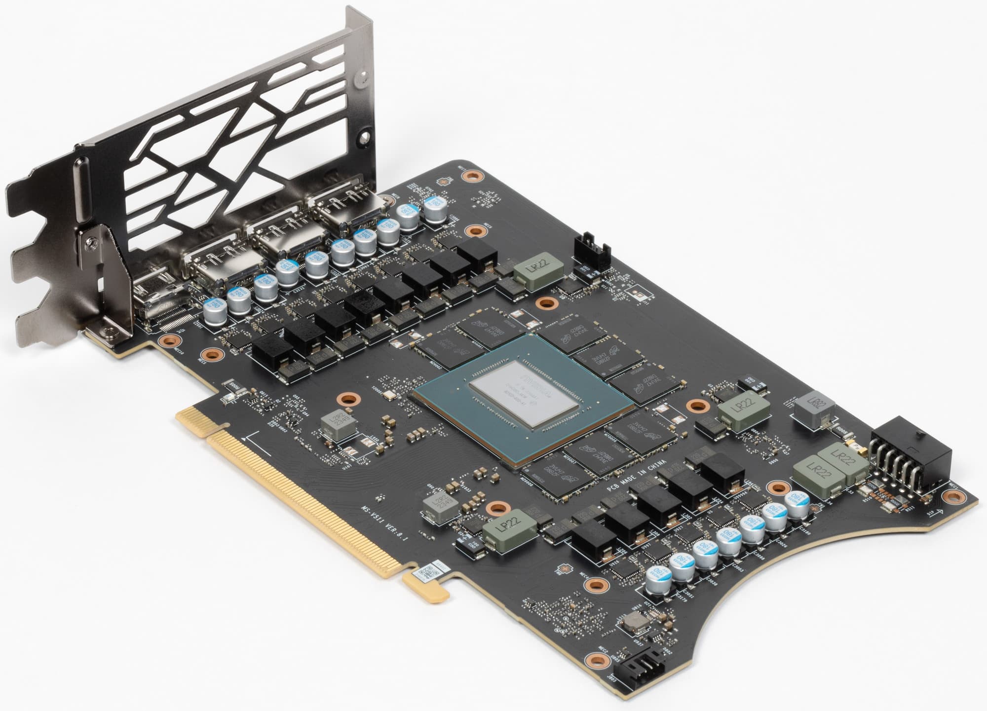 Мы сравниваем эту карту с другой моделью того же производителя более раннего выпуска (что логично), ибо разница, по сути, только в урезанности GPU. Прекрасно видно, что печатная плата полностью переработана, в том числе под потребности кулера, которому требуется намного более короткая PCB. Также мы видим, что у данной карты значительно упрощена схема питания ядра: фаз намного меньше. Значит ли это, что разгонный потенциал стал ниже? — Не обязательно. Но гибкость смены напряжения уменьшилась, то есть, грубо говоря, карта может потреблять в какой-то момент больше, чем требуется (и чем потребляет в аналогичной ситуации игровая версия Gaming X Trio).