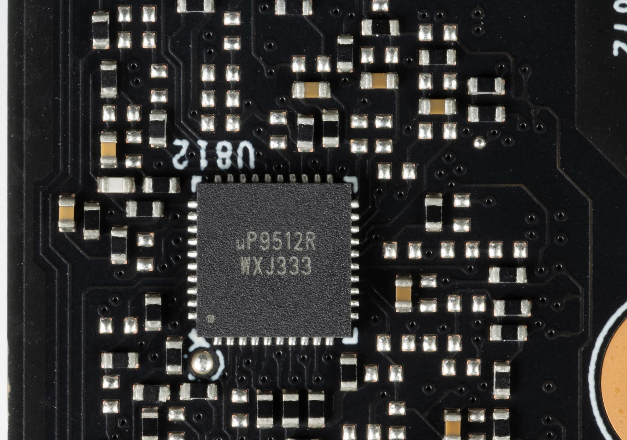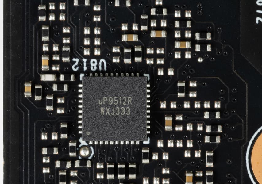 13 фазами питания ядра управляет ШИМ-контроллер uP9512R (uPI Semiconductor). Разные модификации данного процессора рассчитаны на количество управляемых фаз от 8 до 12. В данном случае используется более дешевый 8-фазный вариант, поэтому 12 фаз управляются попарно, то есть де-факто реализована схема 6×2+1 = 7.