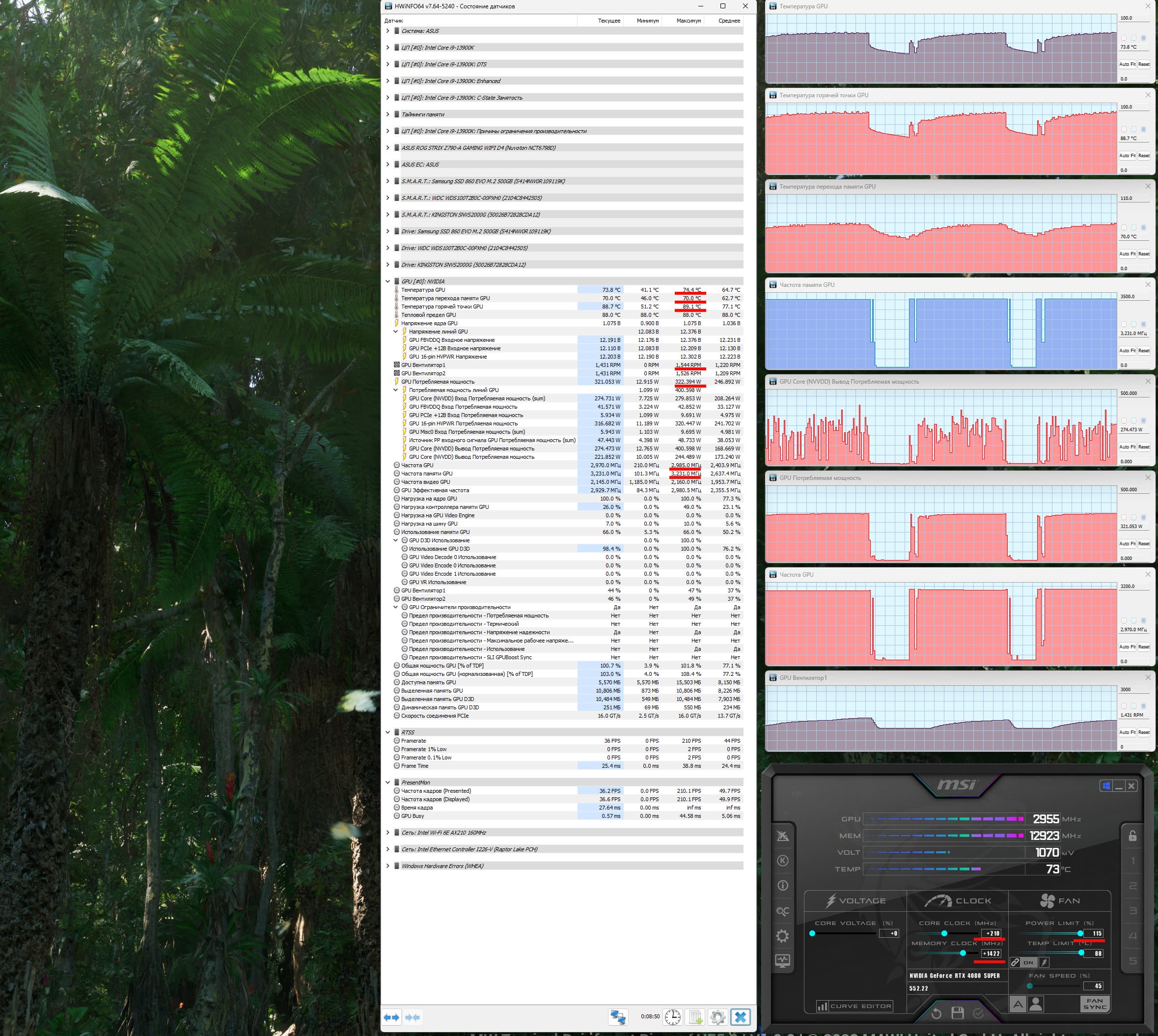 При ручном разгоне параметры нагрева менялись мало (74/70 °С), но максимальное потребление выросло до 322 Вт (пиковое 401 Вт), прибавилось 6,5%-7% производительности, при этом температура самой горячей точки ГП (hot spot) составляла 89 °C.