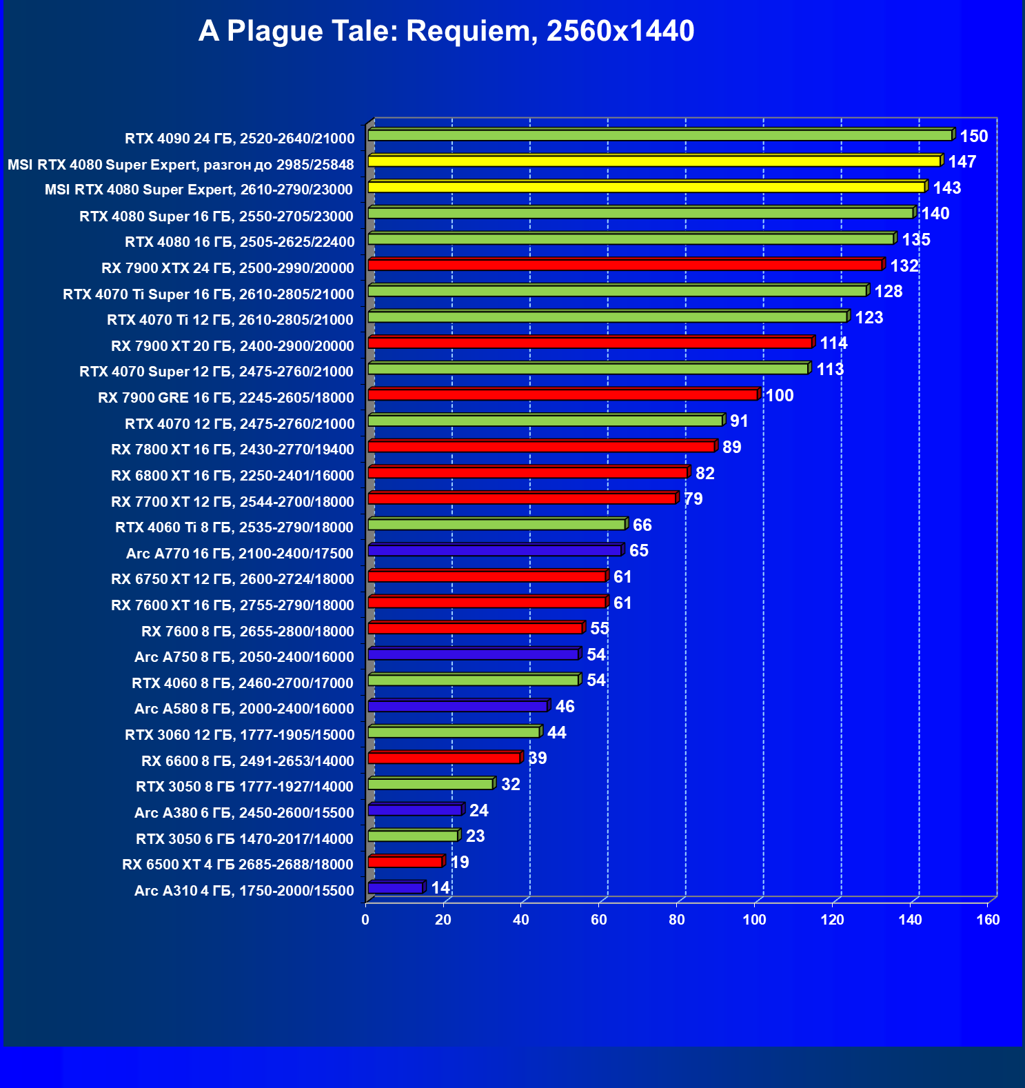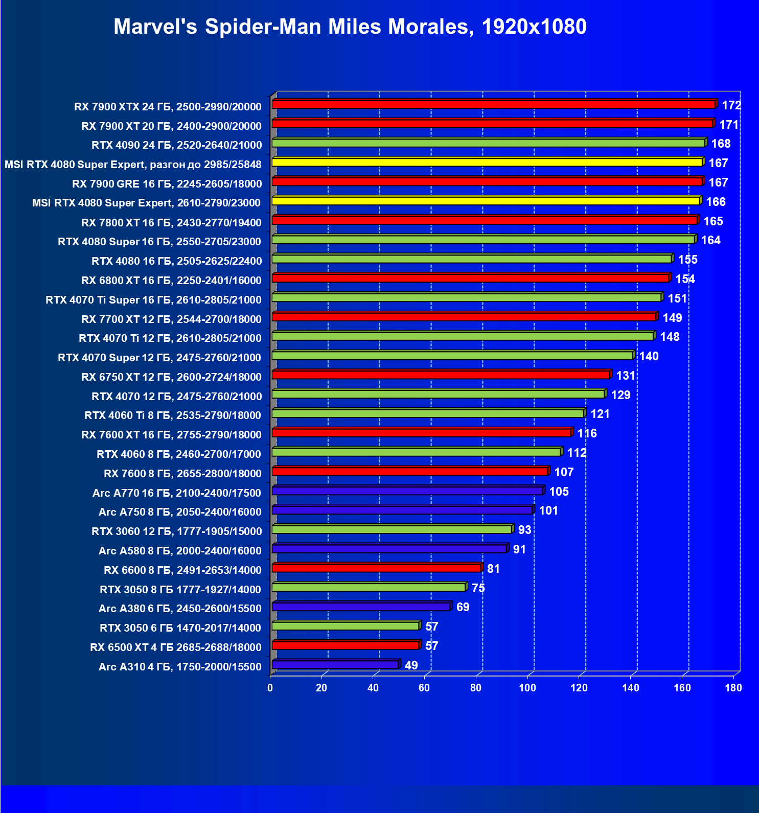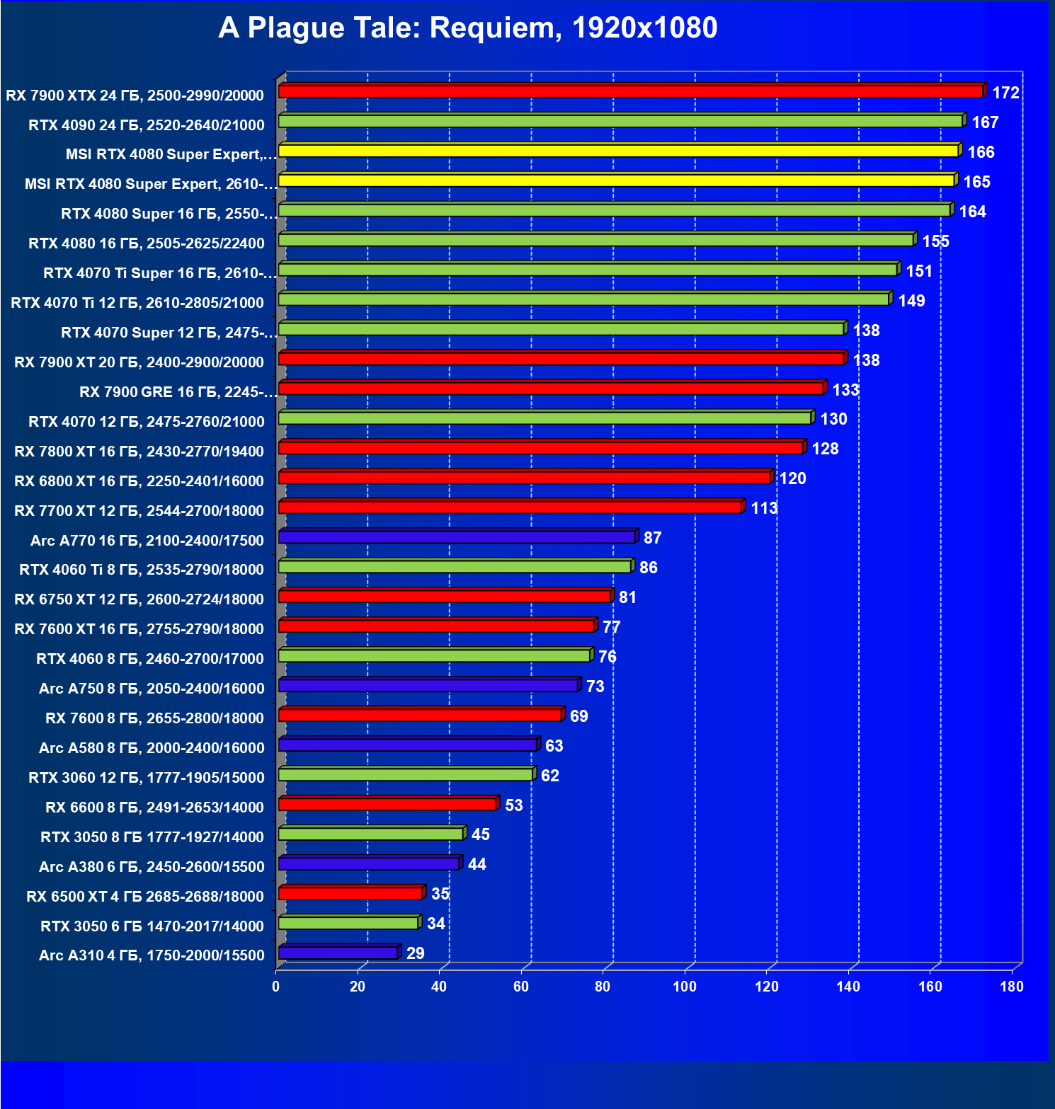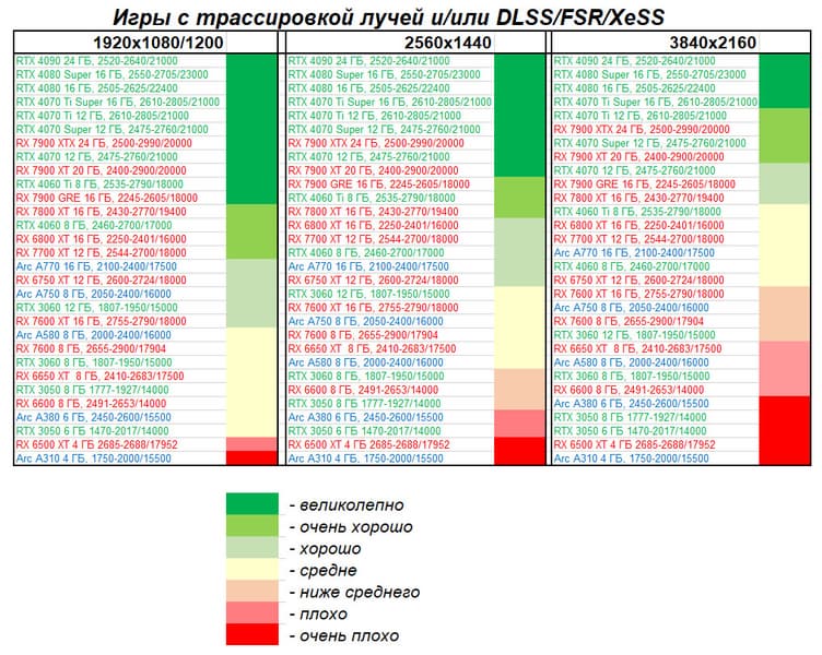 Понятно, что у более дешевых карт Radeon RX 7900 XT/XTX рейтинг выше, но опять акцентируем внимание на том, что в данном случае мы говорим о классических играх без трассировки лучей и технологий масштабирования.