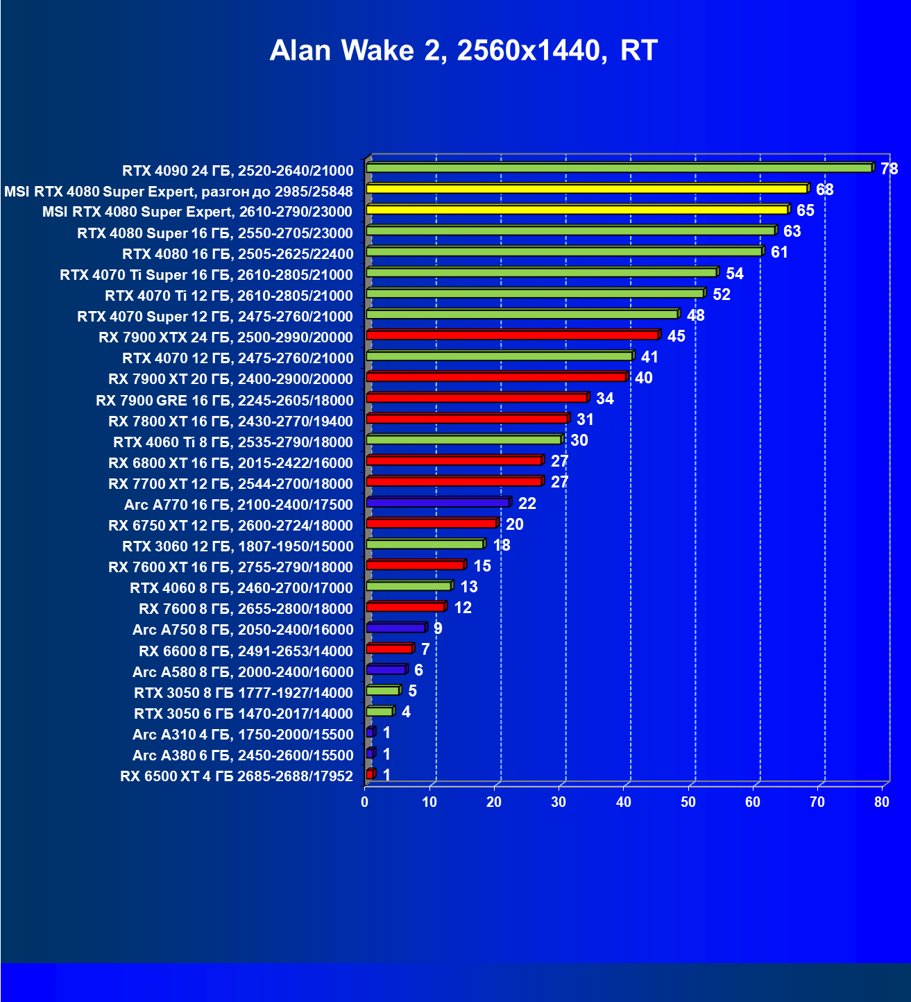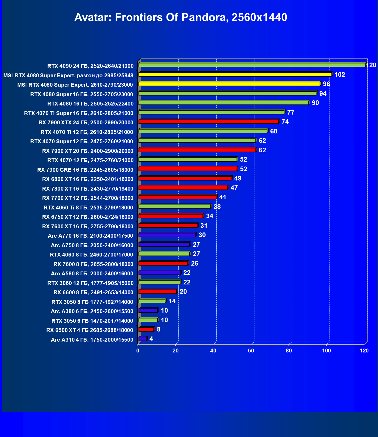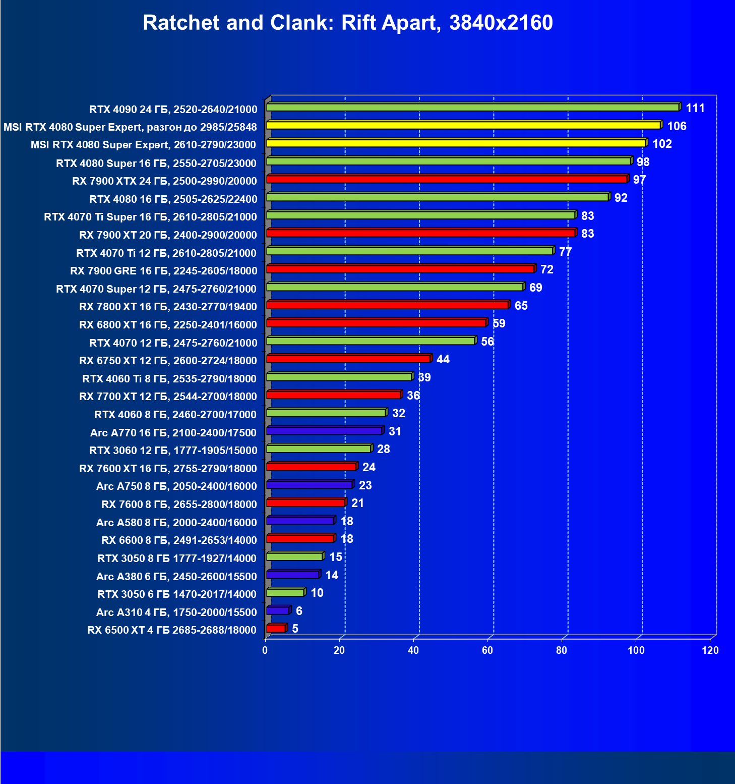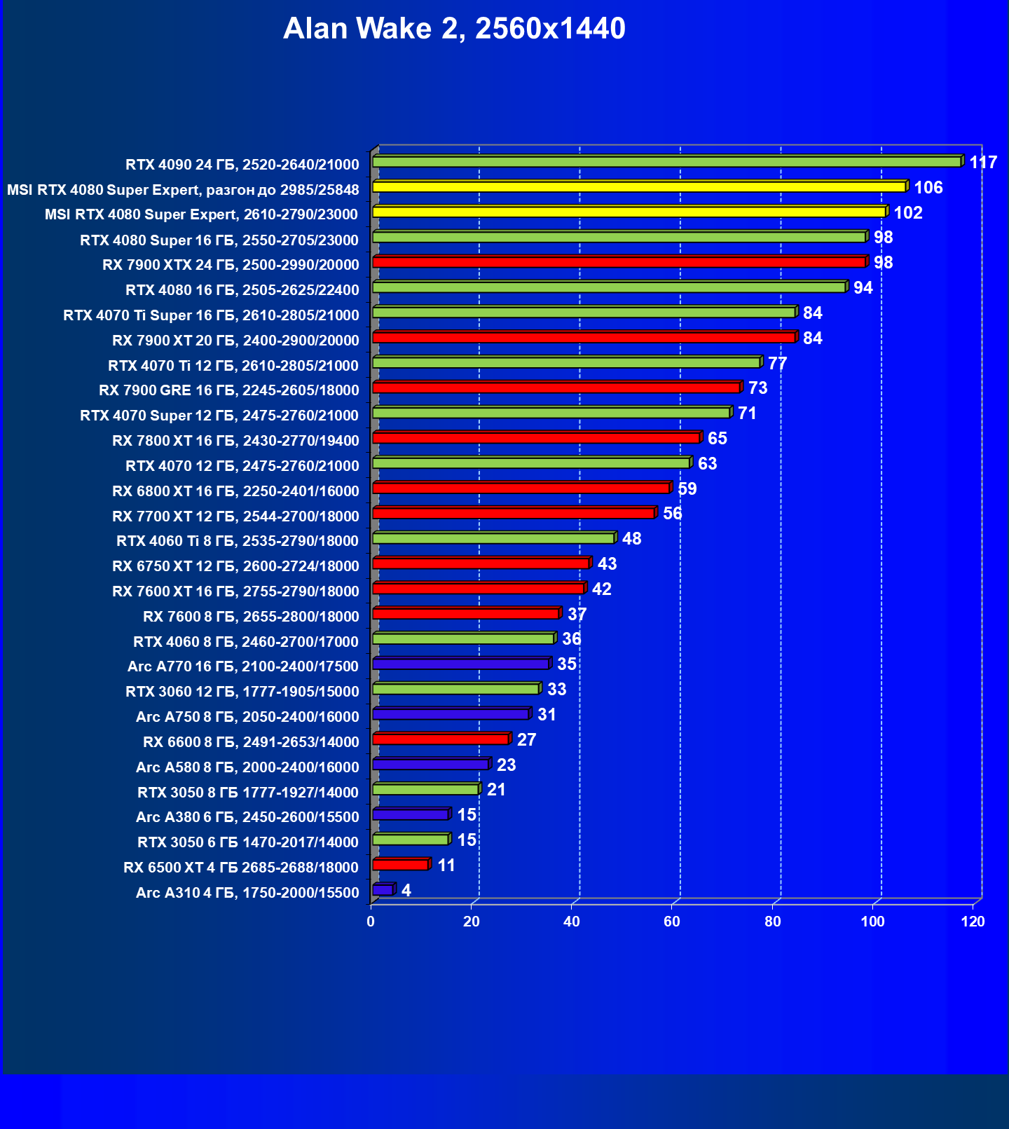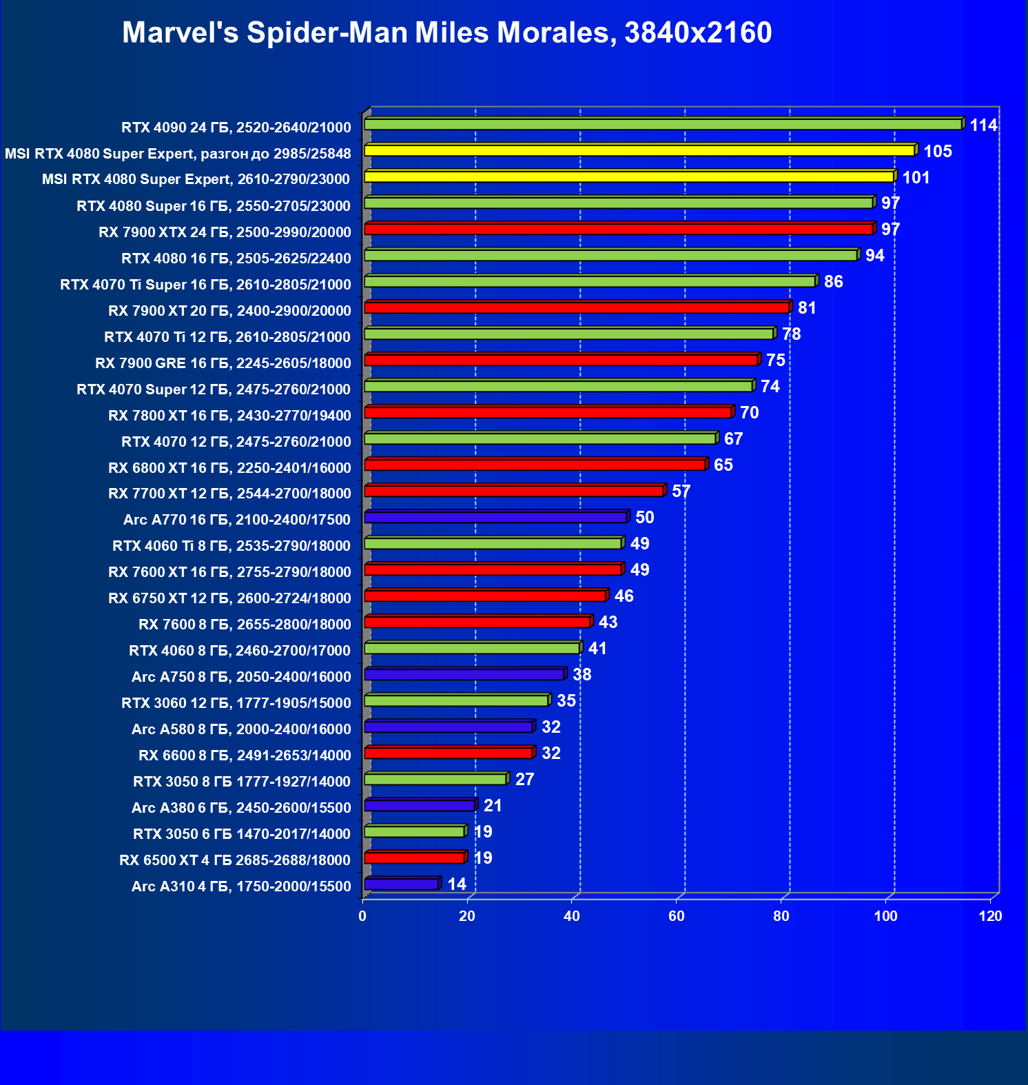| 02 | MSI RTX 4080 Super Expert, разгон до 2985/25848 | 5492 | 416 | 132 000 |