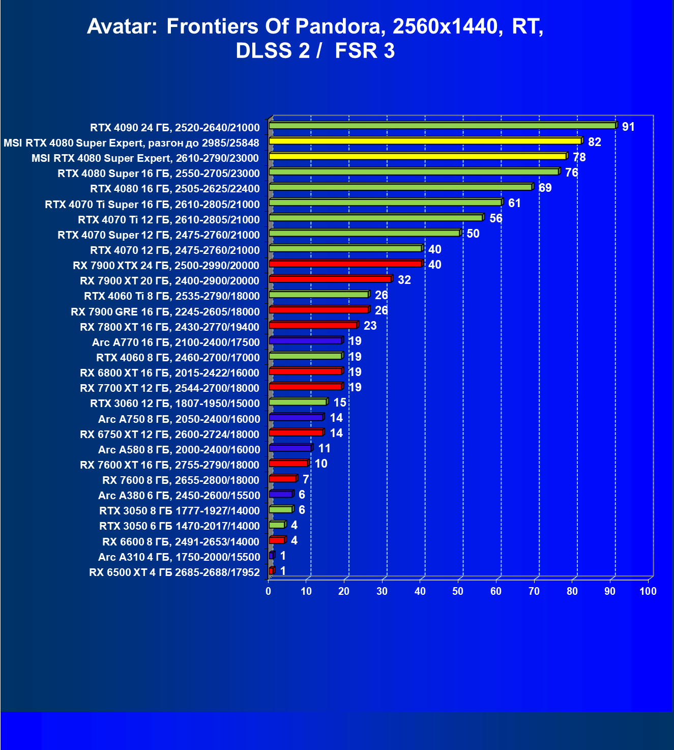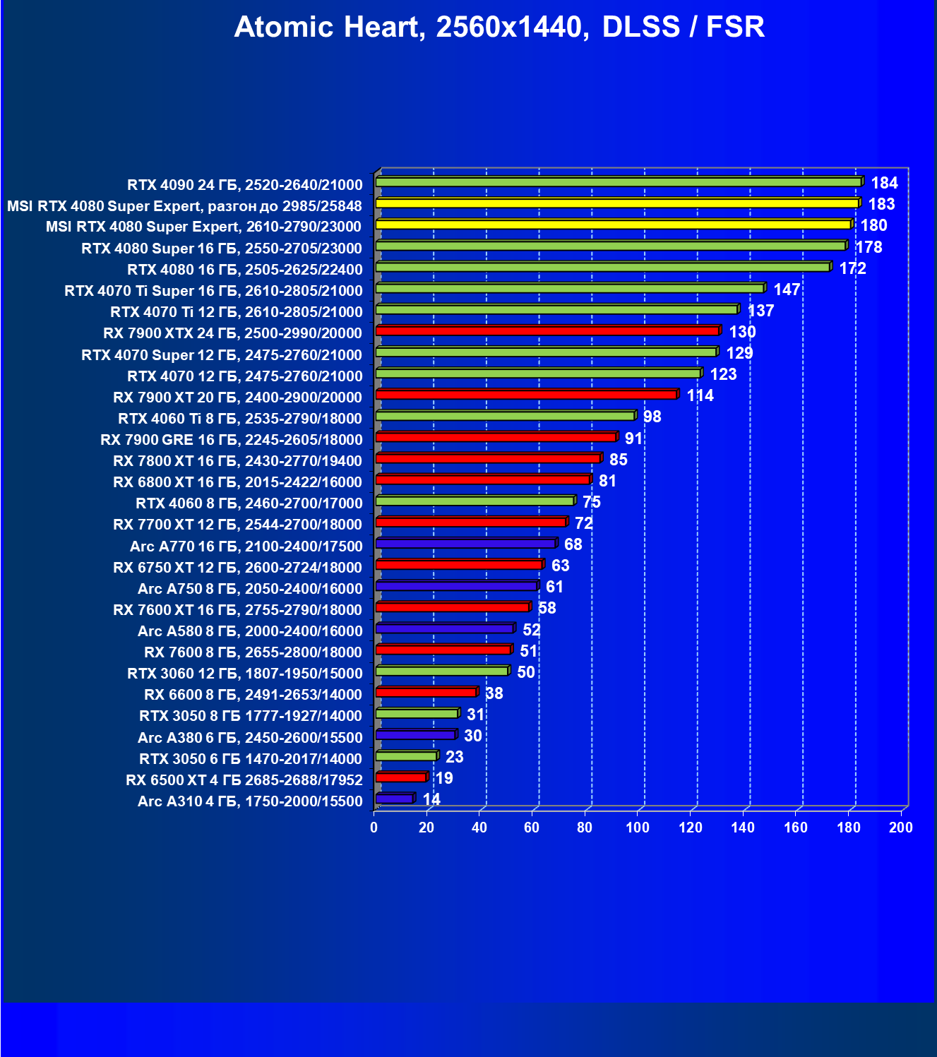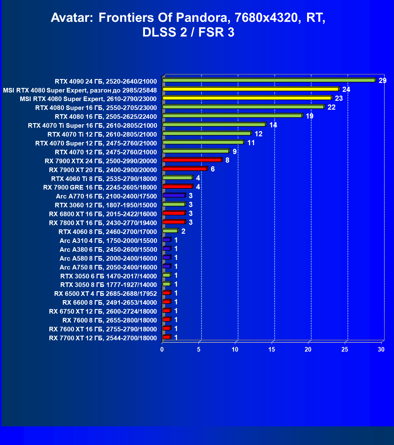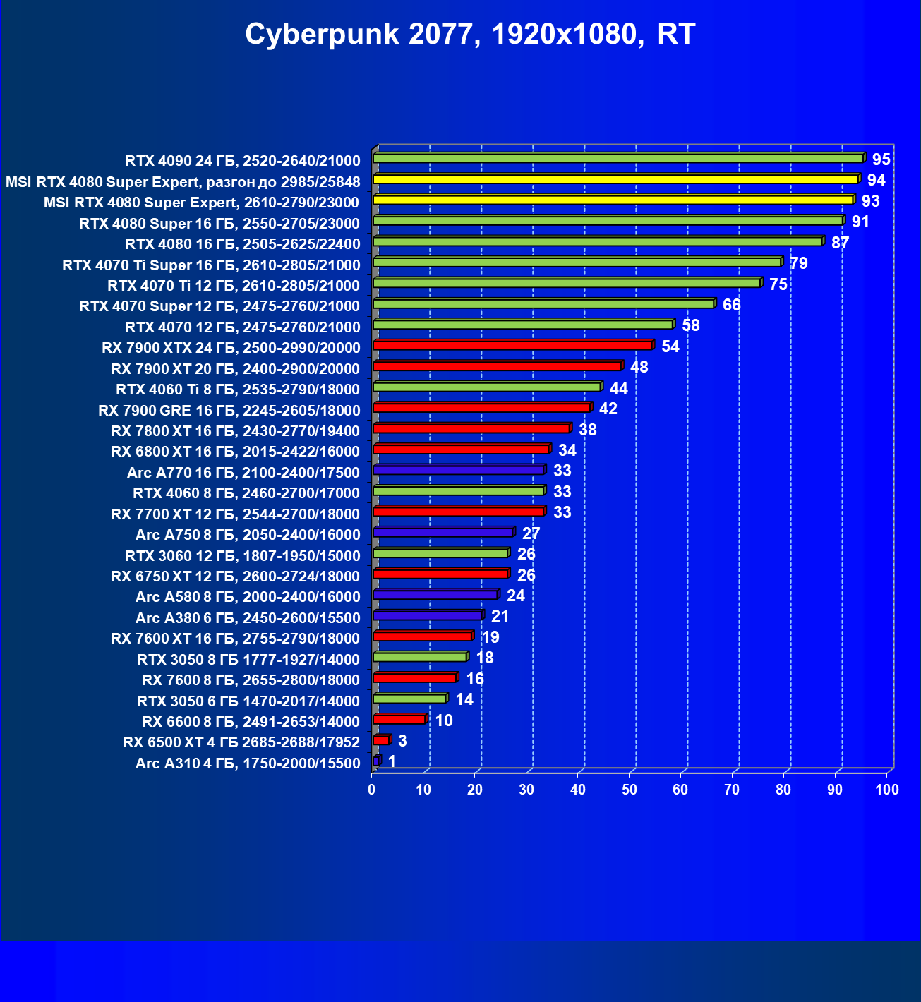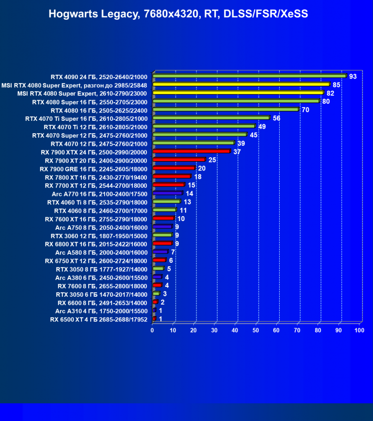 | 17 | RX 7900 XT 20 ГБ, 2400—2900/20000 | 306 | 2908 | 95 000 |