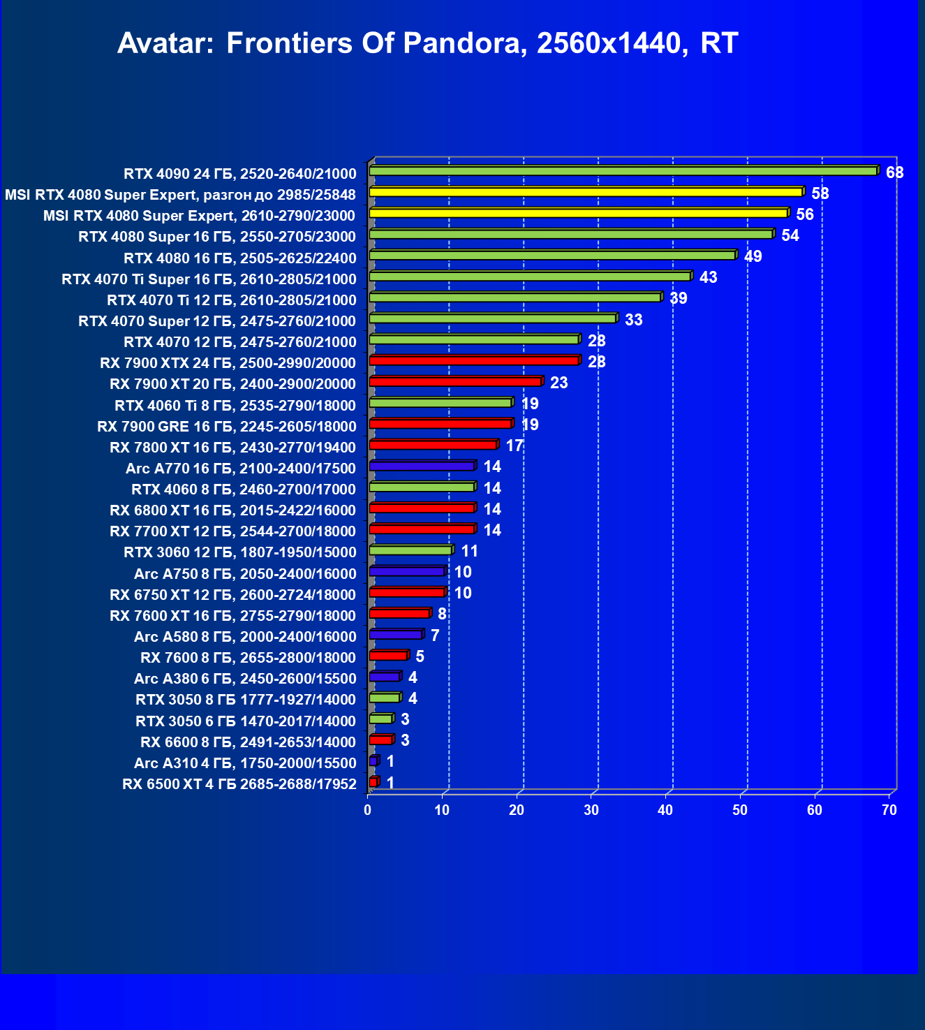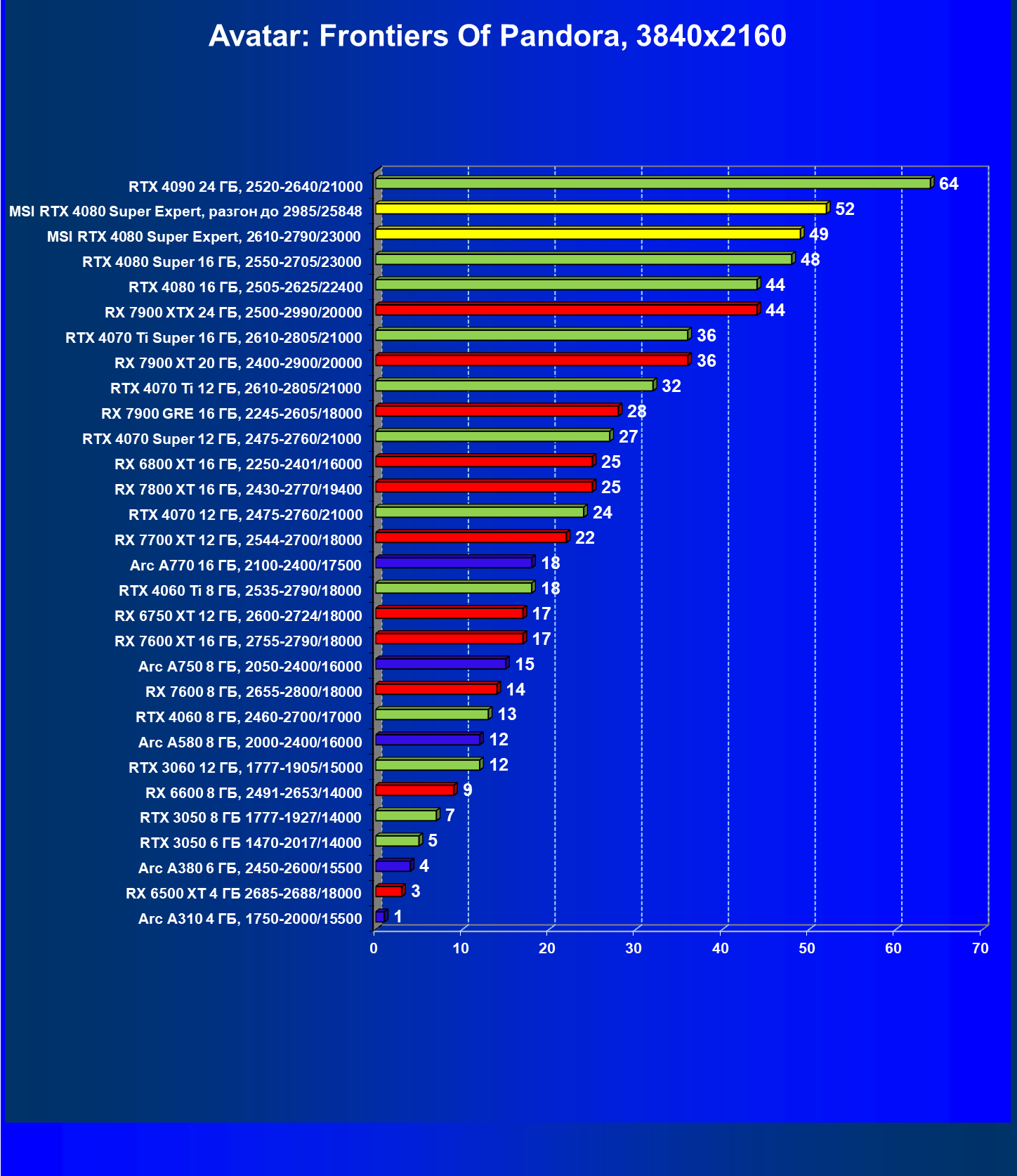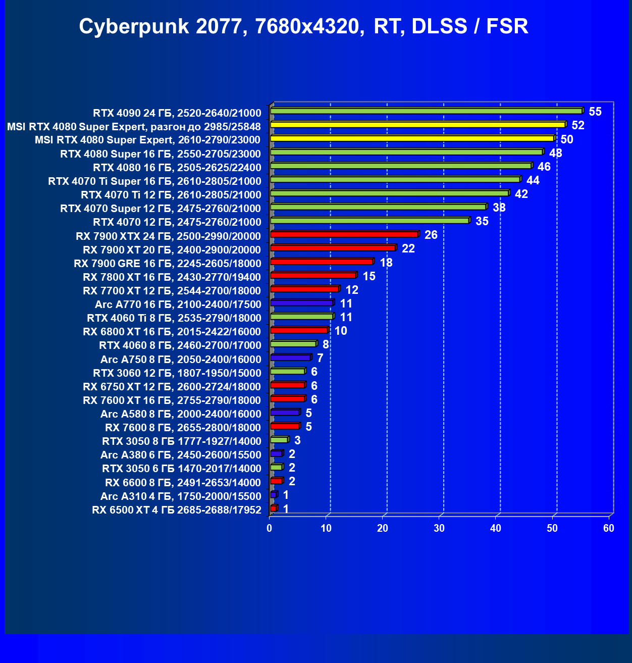 | 09 | MSI RTX 4080 Super Expert, разгон до 2985/25848 | 416 | 5492 | 132 000 |