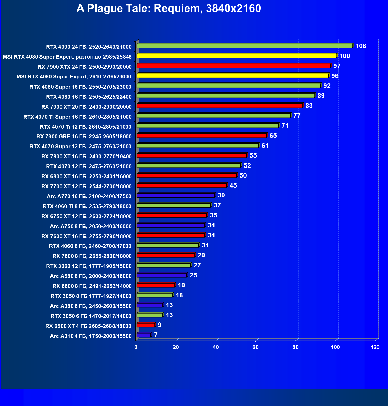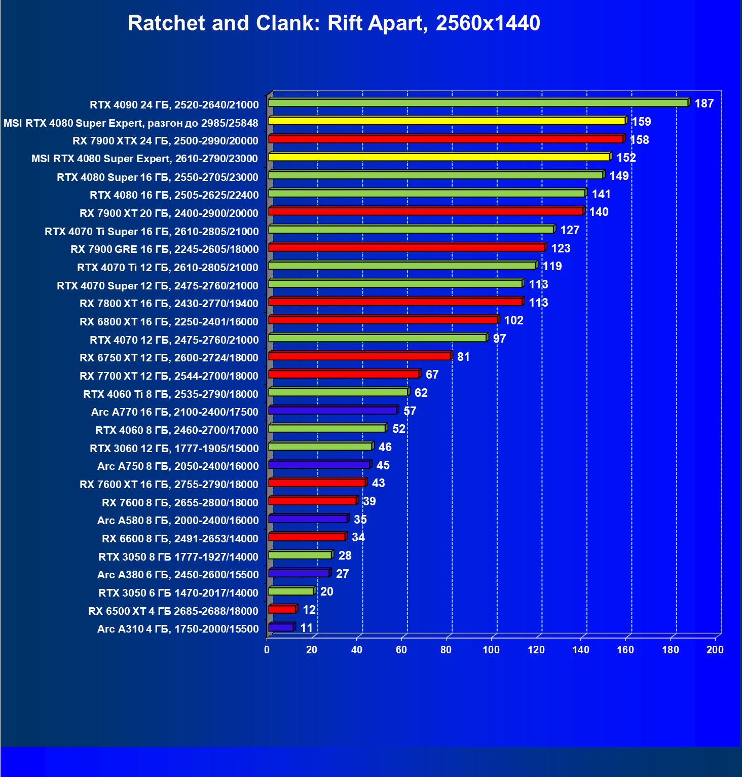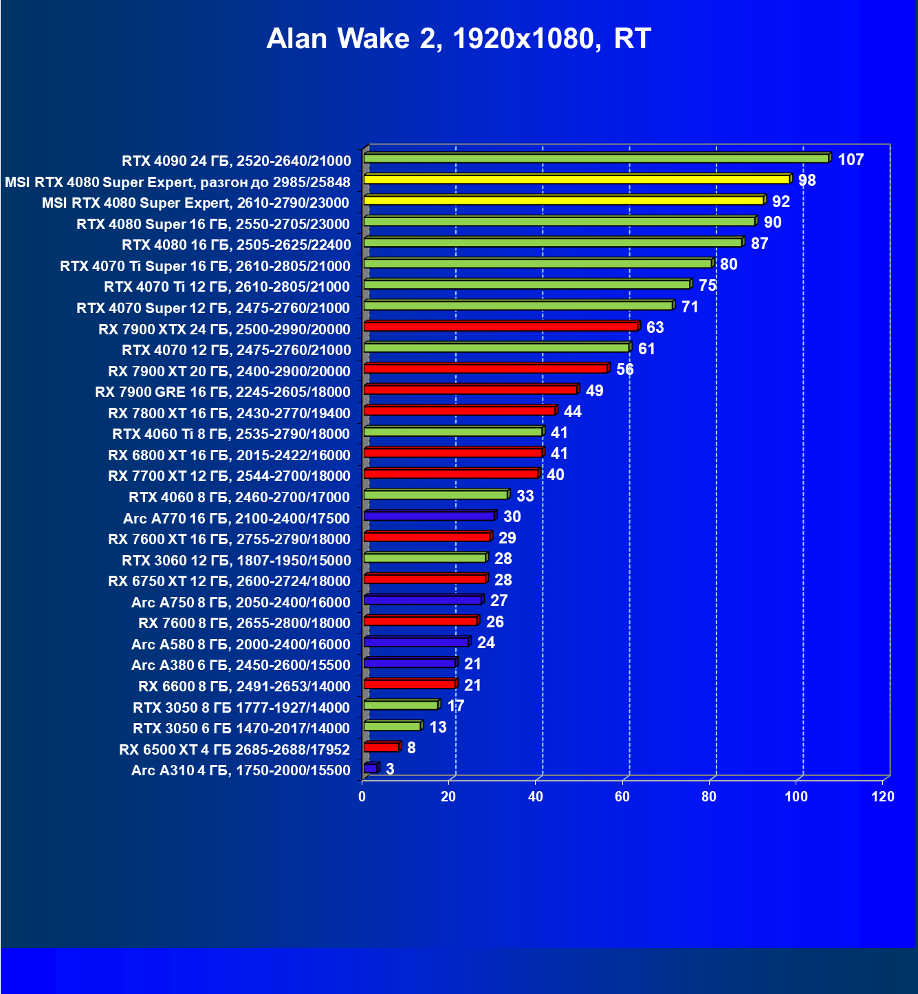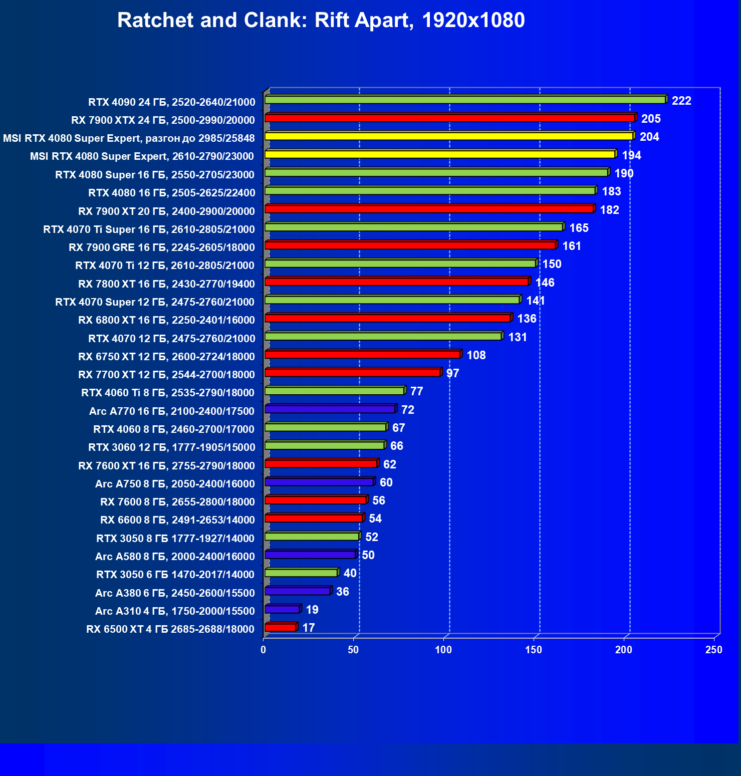 | 08 | RX 7900 XTX 24 ГБ, 2500—2990/20000 | 3473 | 302 | 115 000 |