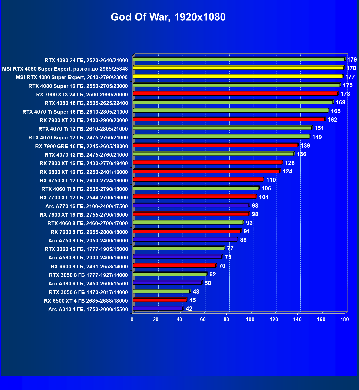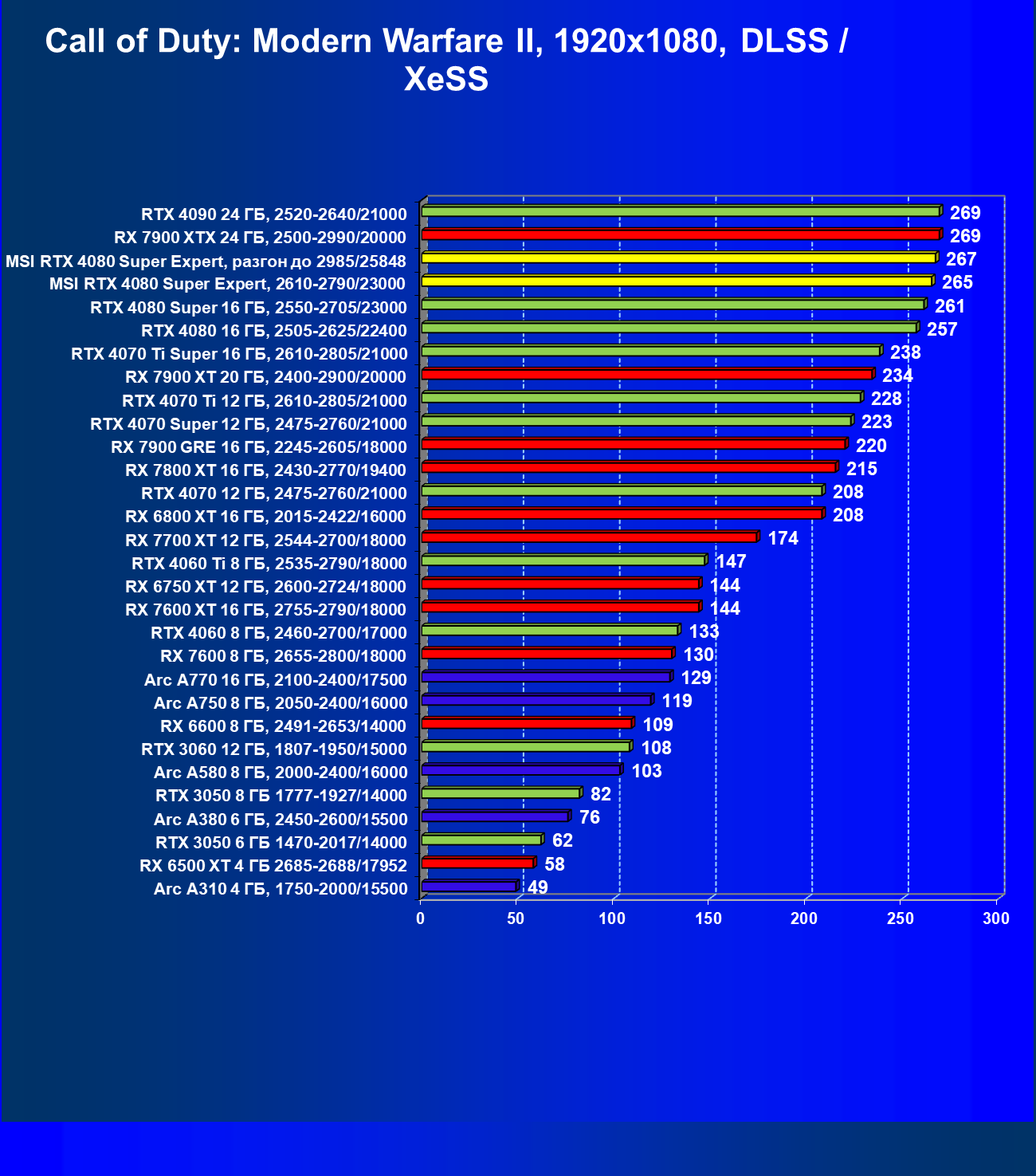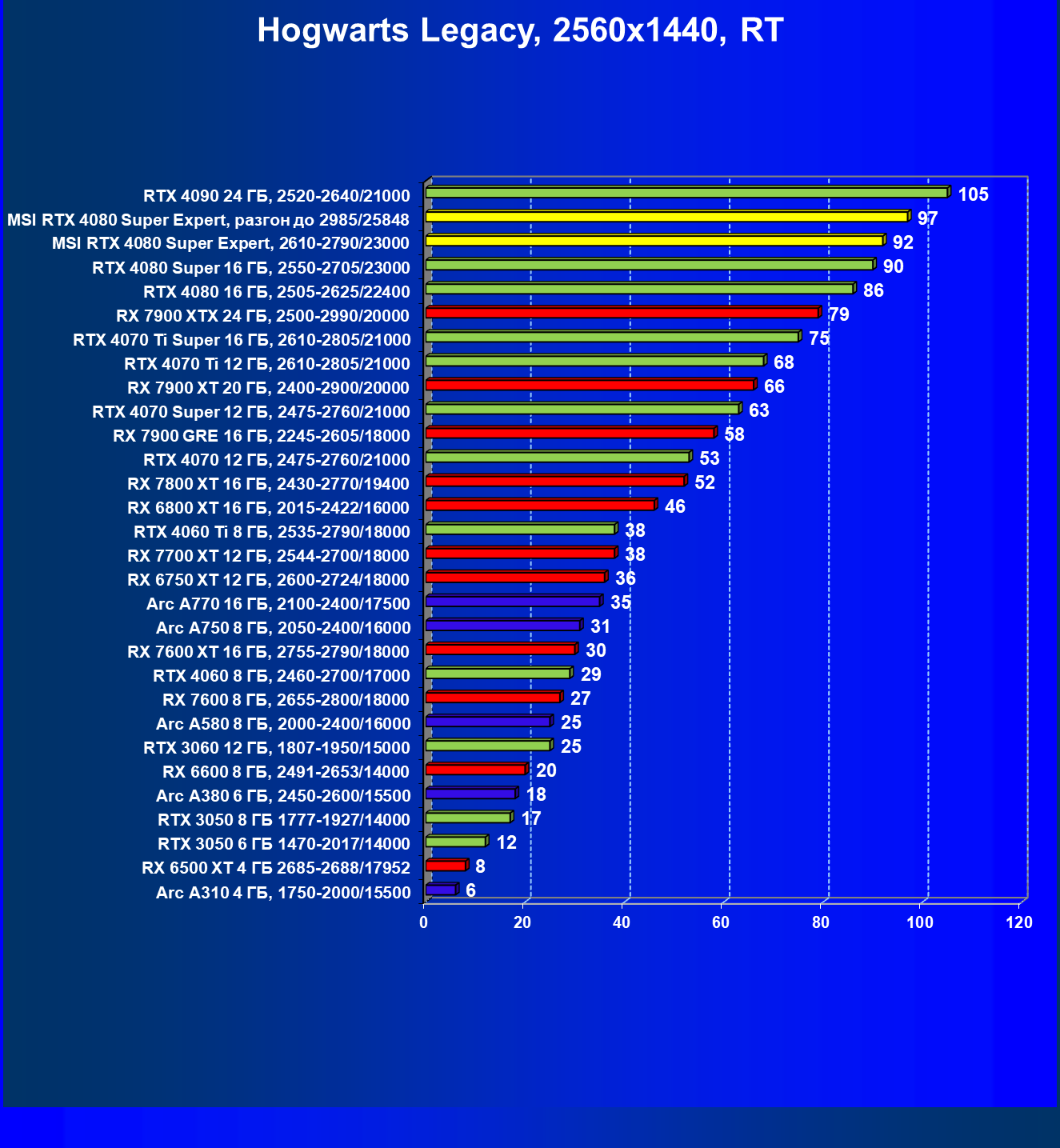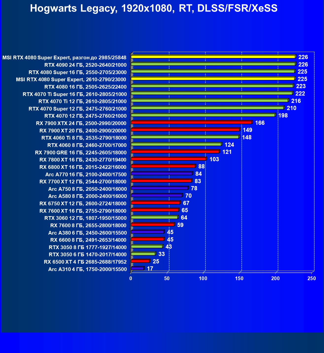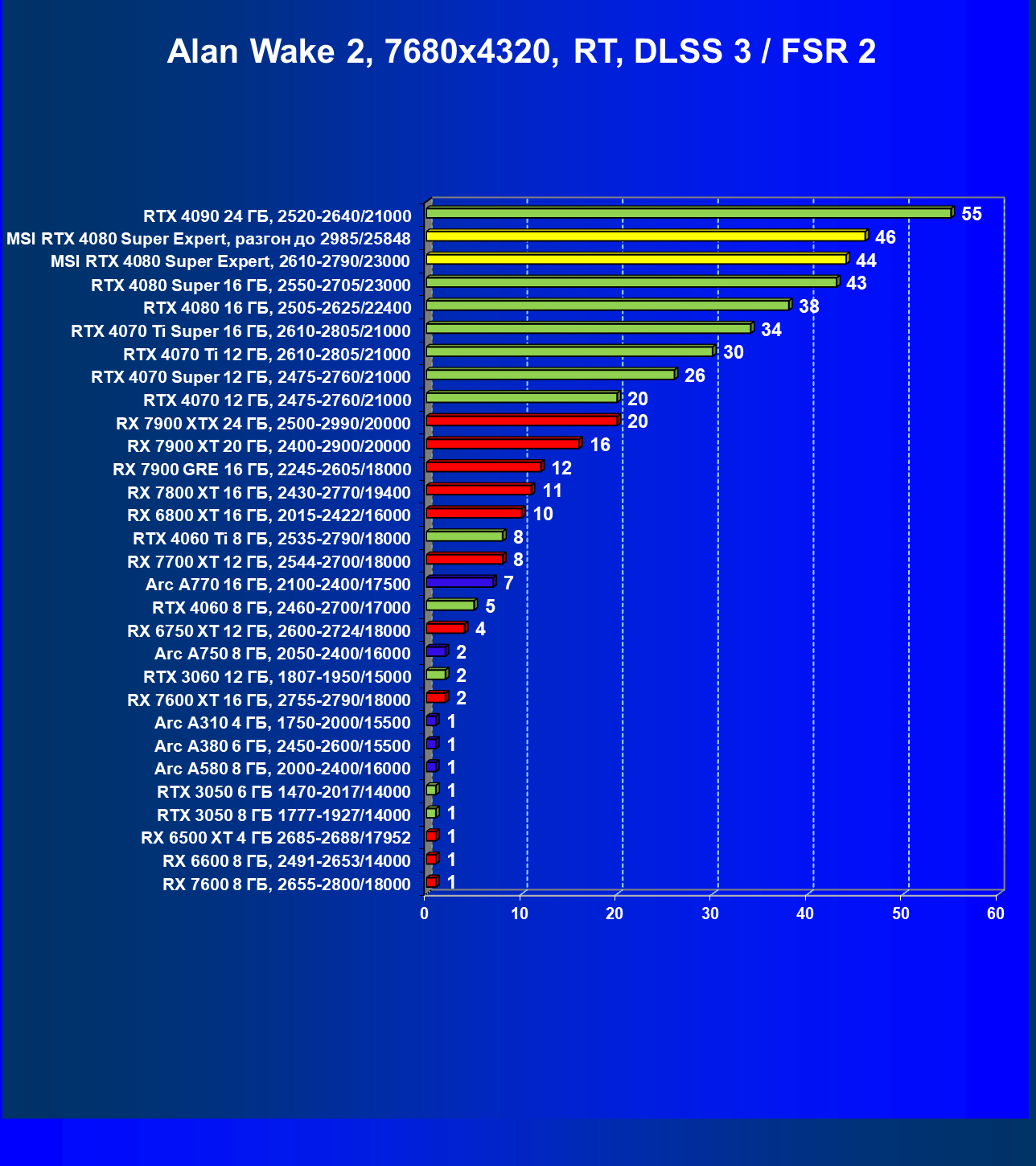 | 08 | RX 7900 XTX 24 ГБ, 2500—2990/20000 | 3473 | 302 | 115 000 |