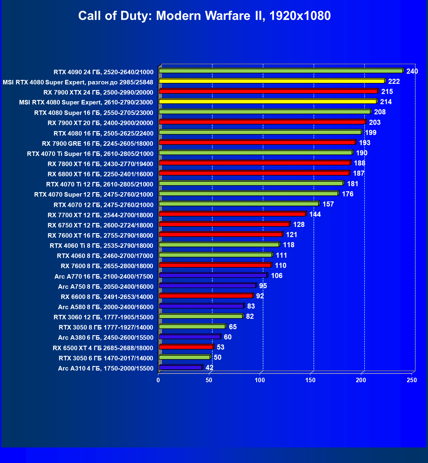 | 17 | RX 7900 XT 20 ГБ, 2400—2900/20000 | 249 | 2365 | 95 000 |