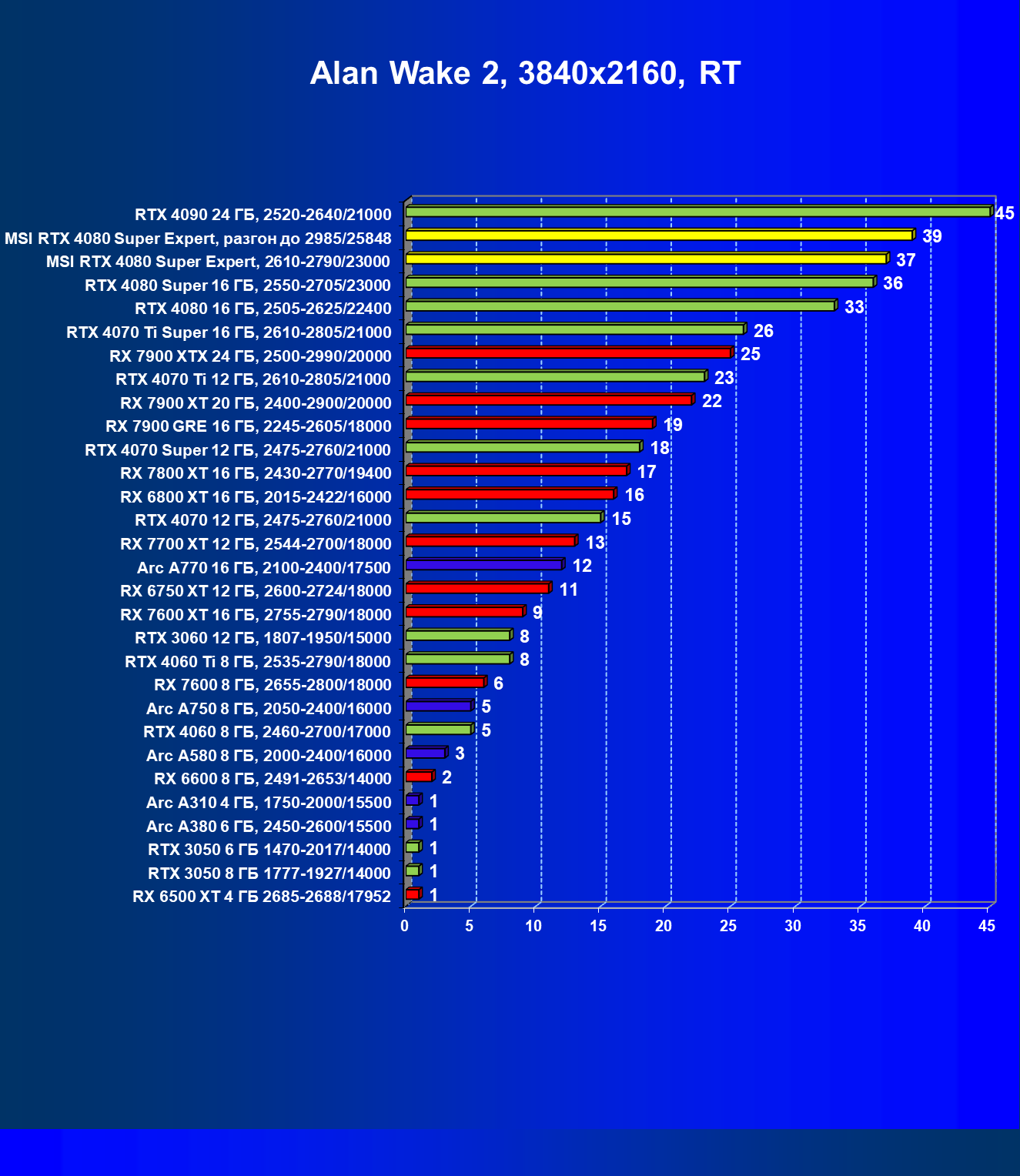| 22 | MSI RTX 4080 Super Expert, разгон до 2985/25848 | 229 | 3024 | 132 000 |