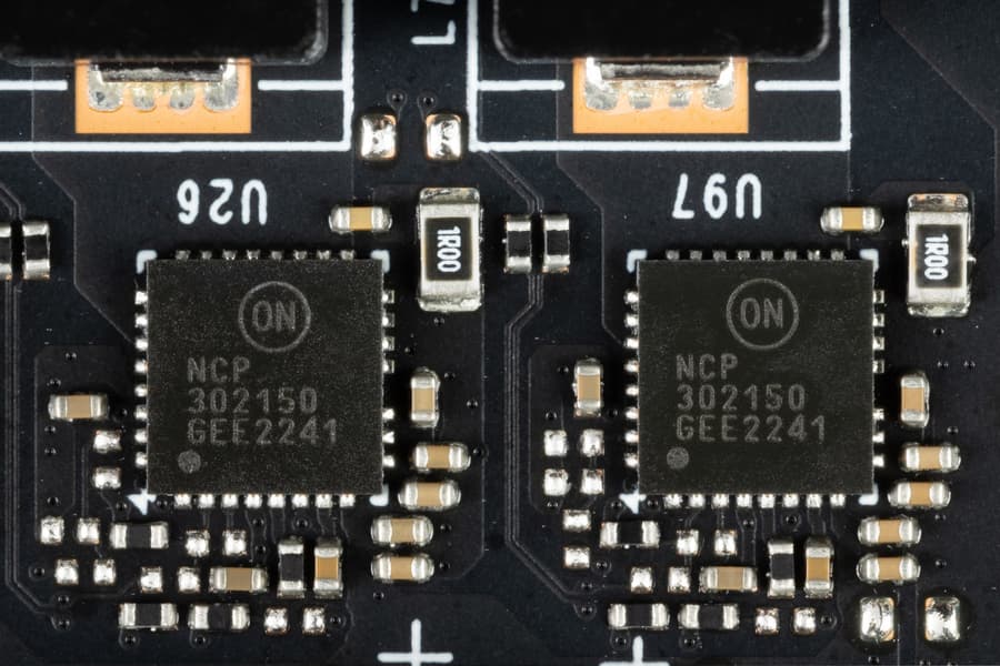 В преобразователе питания используются транзисторные сборки DrMOS — в данном случае NCP302150 (On Semi), каждая из которых рассчитана максимально на 50 А. Казалось бы, зачем такой запас по току? 13 фаз × 50 A = 650 A. Но дело в том, что каждая сборка имеет определенный КПД, и обычно он падает с увеличением нагрузки. Именно поэтому количество и компоненты фаз питания на видеокартах всегда с лихвой перекрывают максимальные потребности GPU.