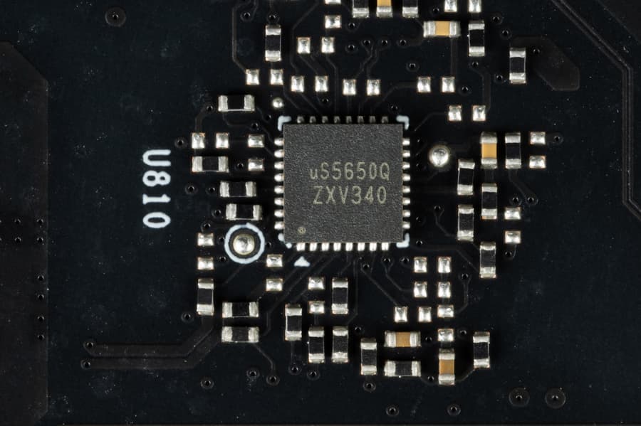 Также на оборотной стороне платы имеется контроллер uS5650Q (uPI Semi), который отвечает за мониторинг карты (отслеживание напряжений и температуры).