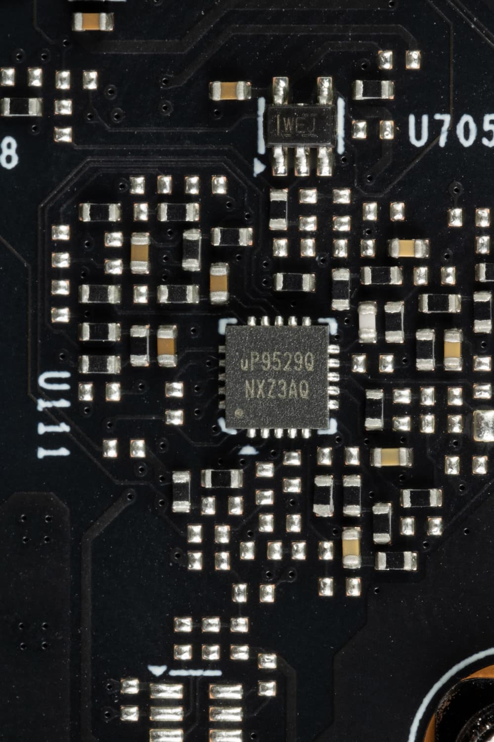 Питанием микросхем памяти управляет ШИМ-контроллер uP9529Q (uPI Semiconductor). Он рассчитан на управление 4 фазами.
