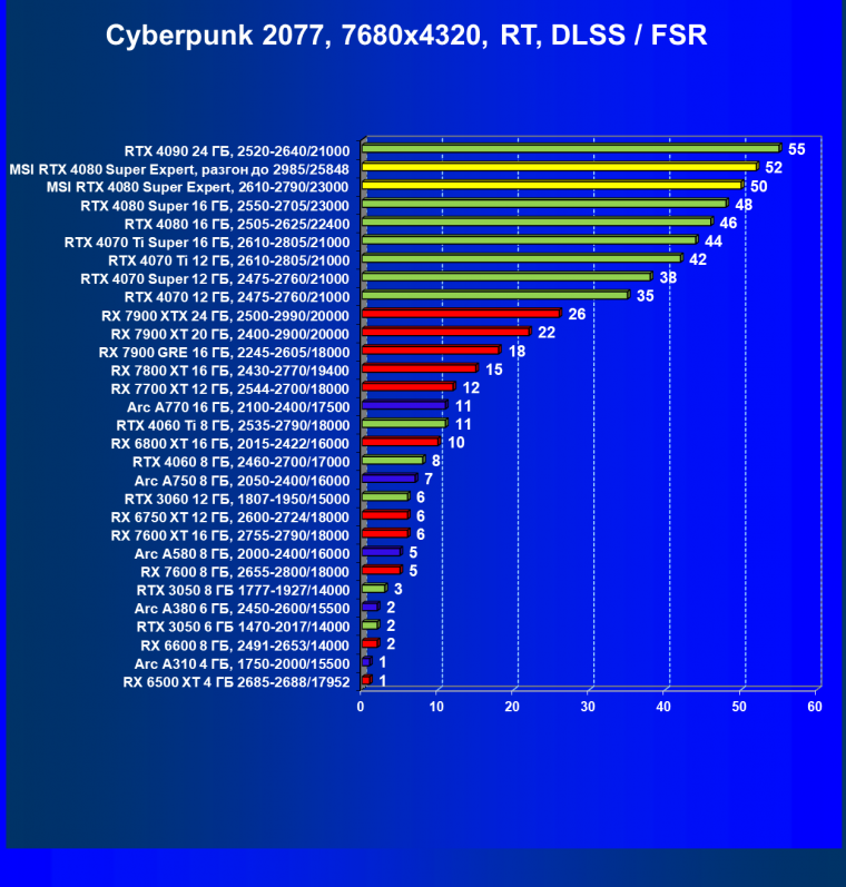 | 10 | MSI RTX 4080 Super Expert, 2610—2790/23000 | 399 | 5260 | 132 000 |