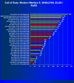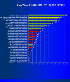 Рейтинг составлен по 9 тестам, в которых используется технология трассировки лучей и одновременно технология Nvidia DLSS, AMD FSR или Intel XeSS. Этот рейтинг нормирован по самому слабому ускорителю — Arc A310 (то есть сочетание скорости и функций Arc A310 приняты за 100%).