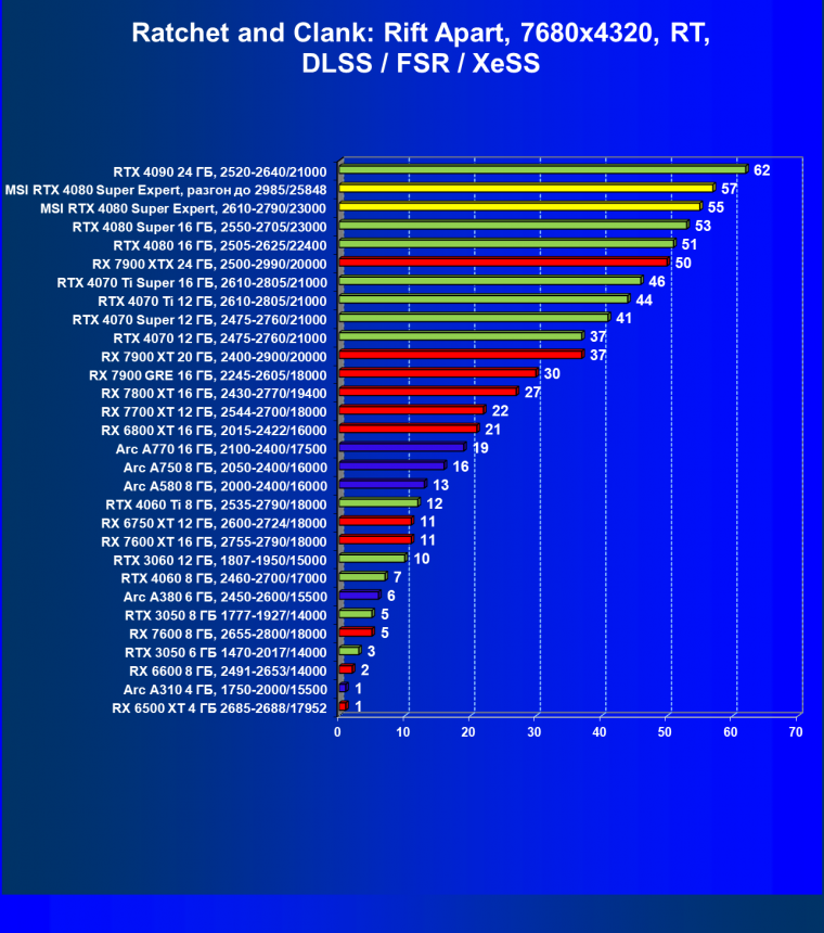 Результаты тестов с включенной аппаратной трассировкой лучей и DLSS/FSR/XeSS в разрешении 7680×4320 (8К)