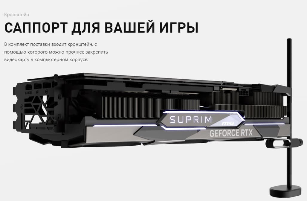 MSI GeForce RTX 4090 Suprim X 24G (24 ГБ) — очень крупный, четырехслотовый представитель флагманского сегмента 3D-графики игрового класса. При ручном разгоне видеокарта может потреблять более 500 Вт, поэтому надо иметь в ПК очень хороший блок питания мощностью минимум 850 Вт. Система охлаждения довольно тихая, лишь в режиме BIOS Gaming ее слышно при сильной нагрузке на карту. Система охлаждения формирует собственный жесткий каркас, а в комплекте идет подставка, что гарантирует отсутствие провисания тяжелой карты в корпусе.