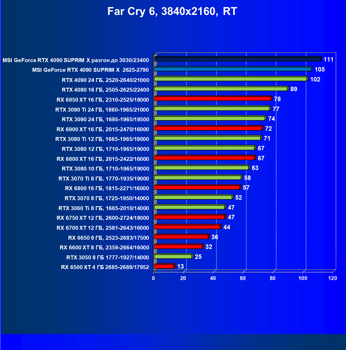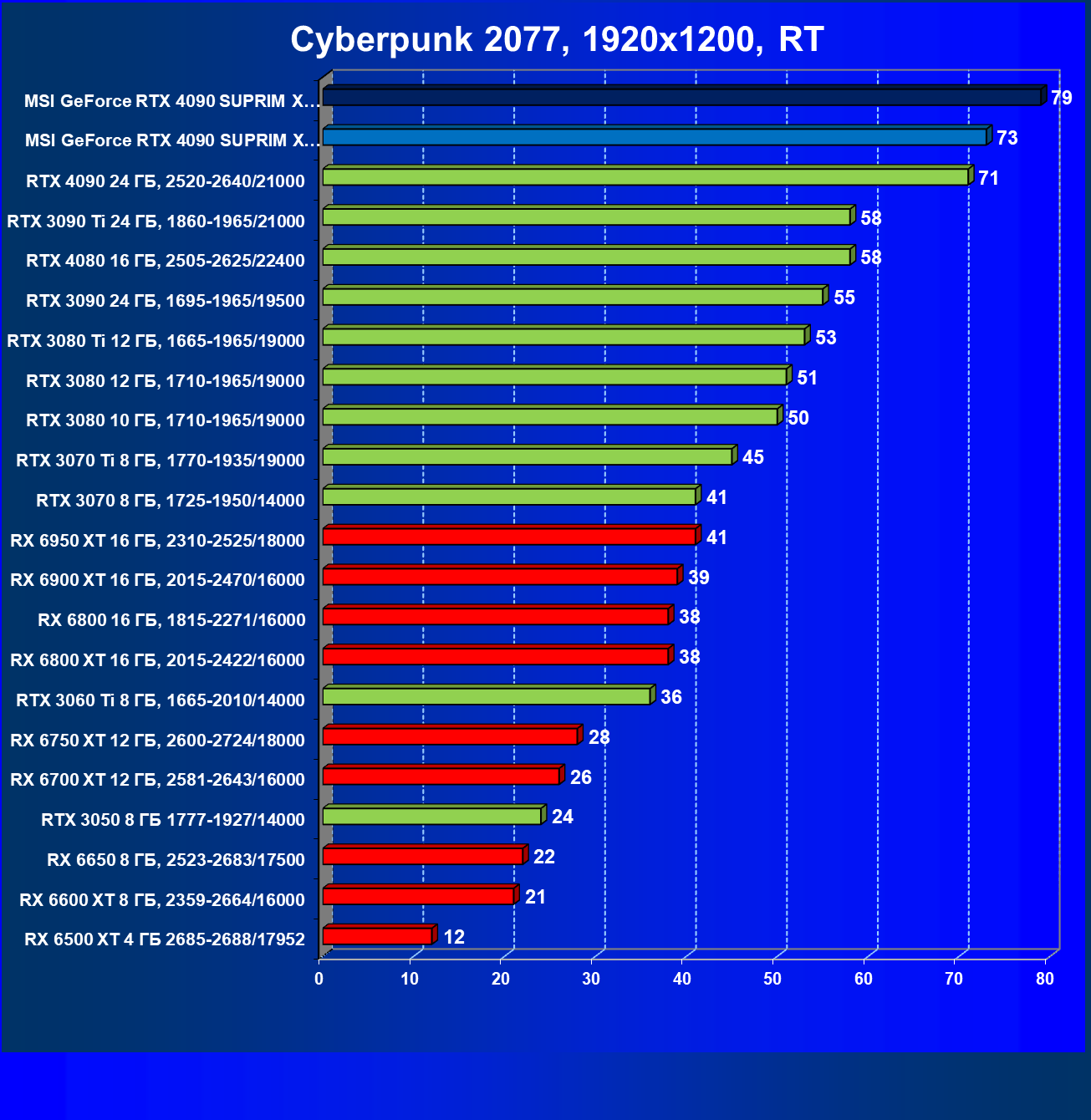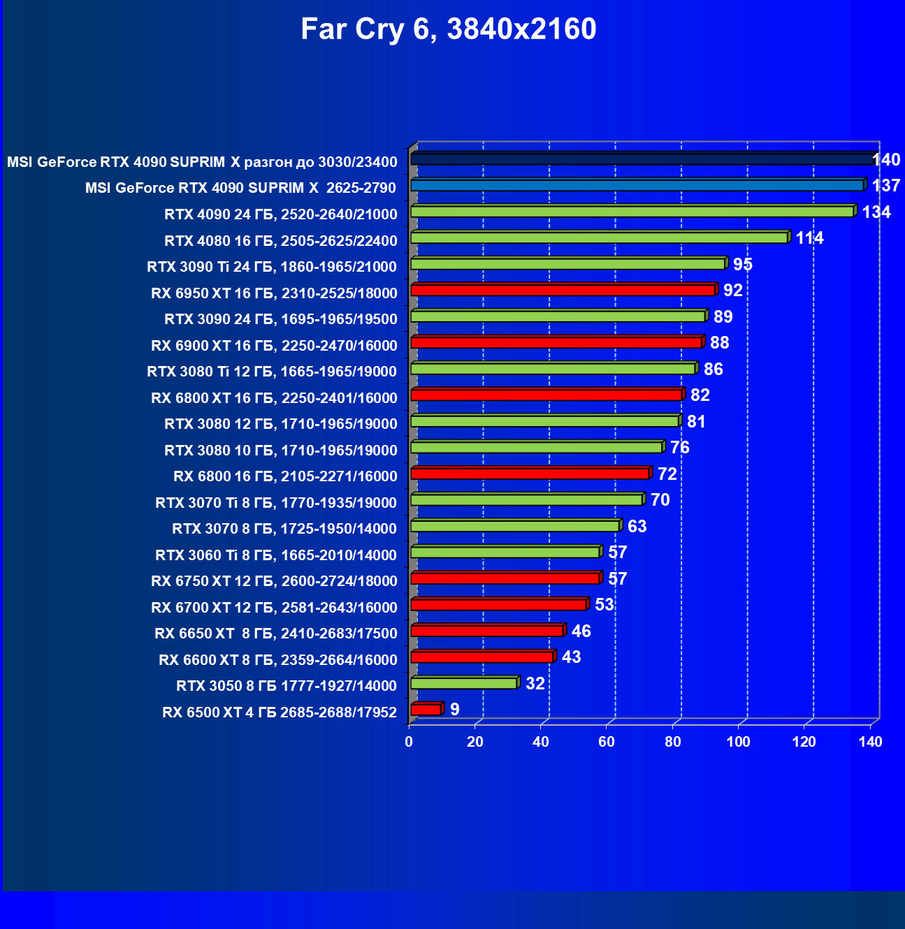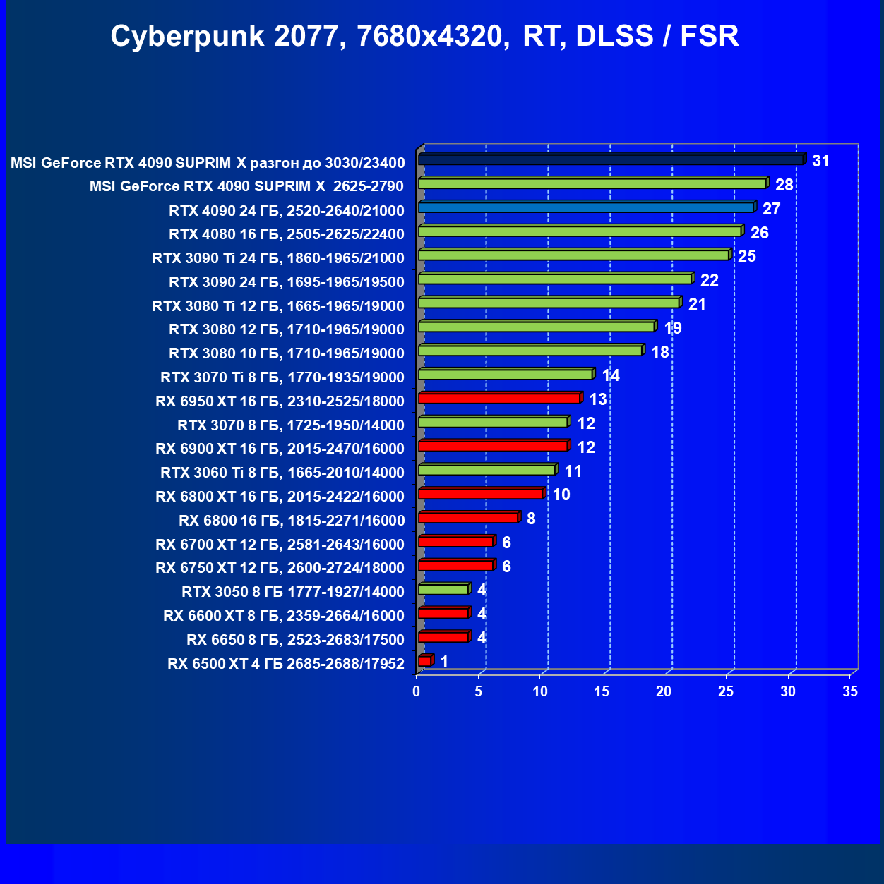 | 01 | MSI GeForce RTX 4090 Suprim Х 24 ГБ, разгон до 2925/23400 | 592 | 33 | 180 000 |