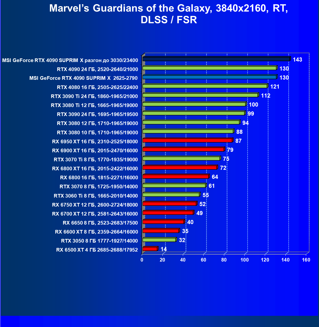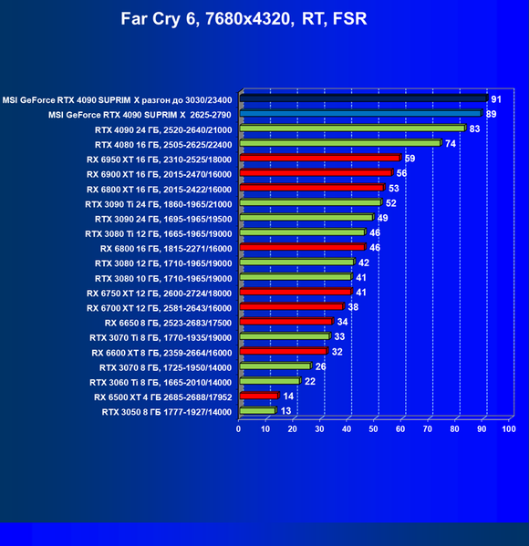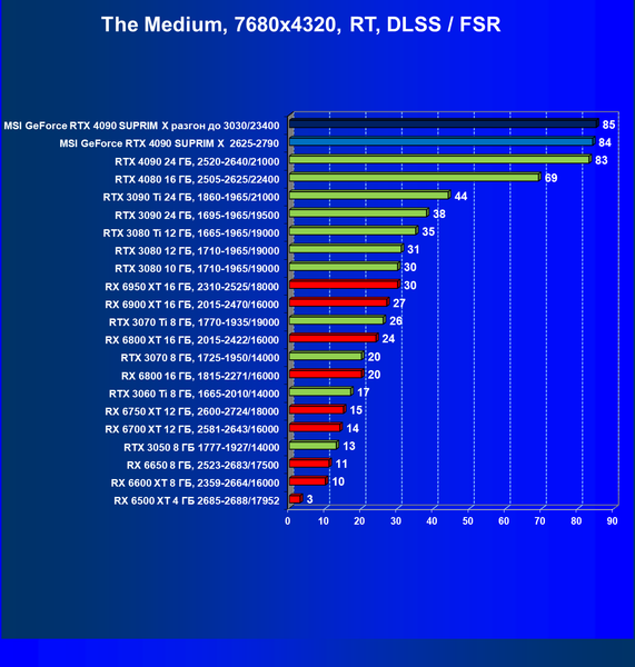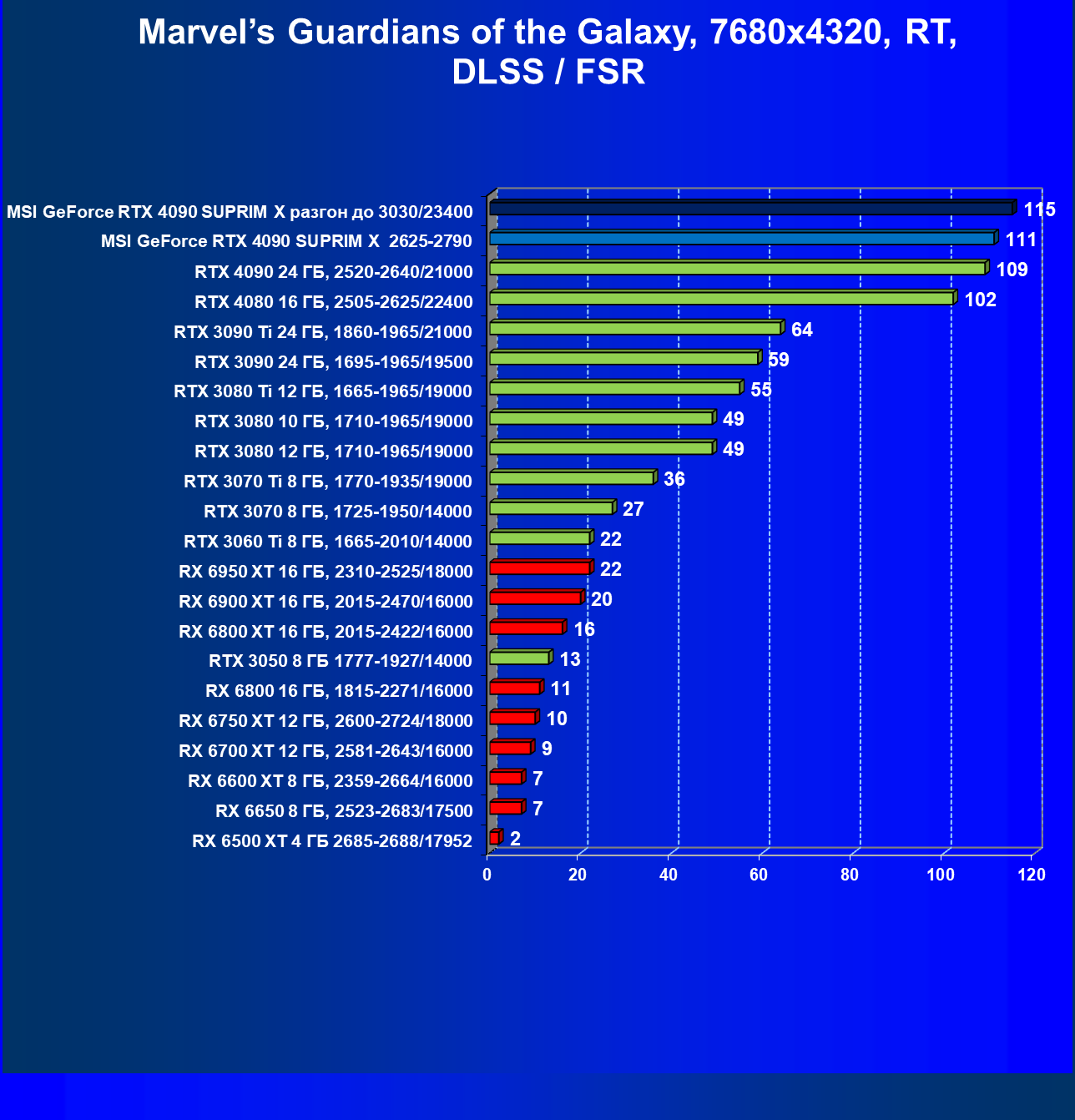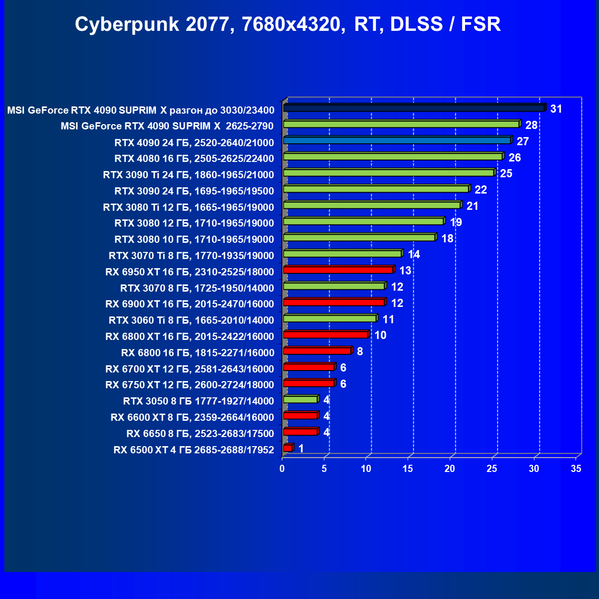 Учитывая, что RTX 4090 является лидером по производительности на сегодня, и тем более с учетом потенциала для разгона у карты MSI, логично было выполнить тесты и в огромном разрешении 8K — разумеется, с применением DLSS/FSR и трассировки лучей.