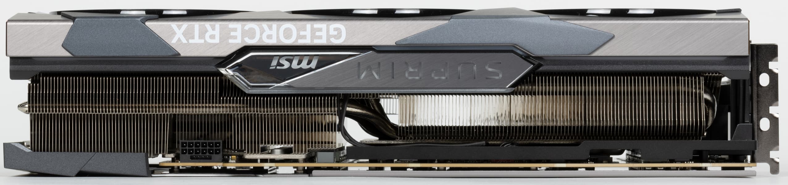 Карта имеет подсветку из ломаных линий справа от каждого вентилятора, она подчеркивает общий стиль дизайна: видно, что инженеры MSI изо всех сил старались сделать свое творение уникальным. Также подсвечен логотип компании на верхнем торце и название серии, к которой относится карта (Suprim).