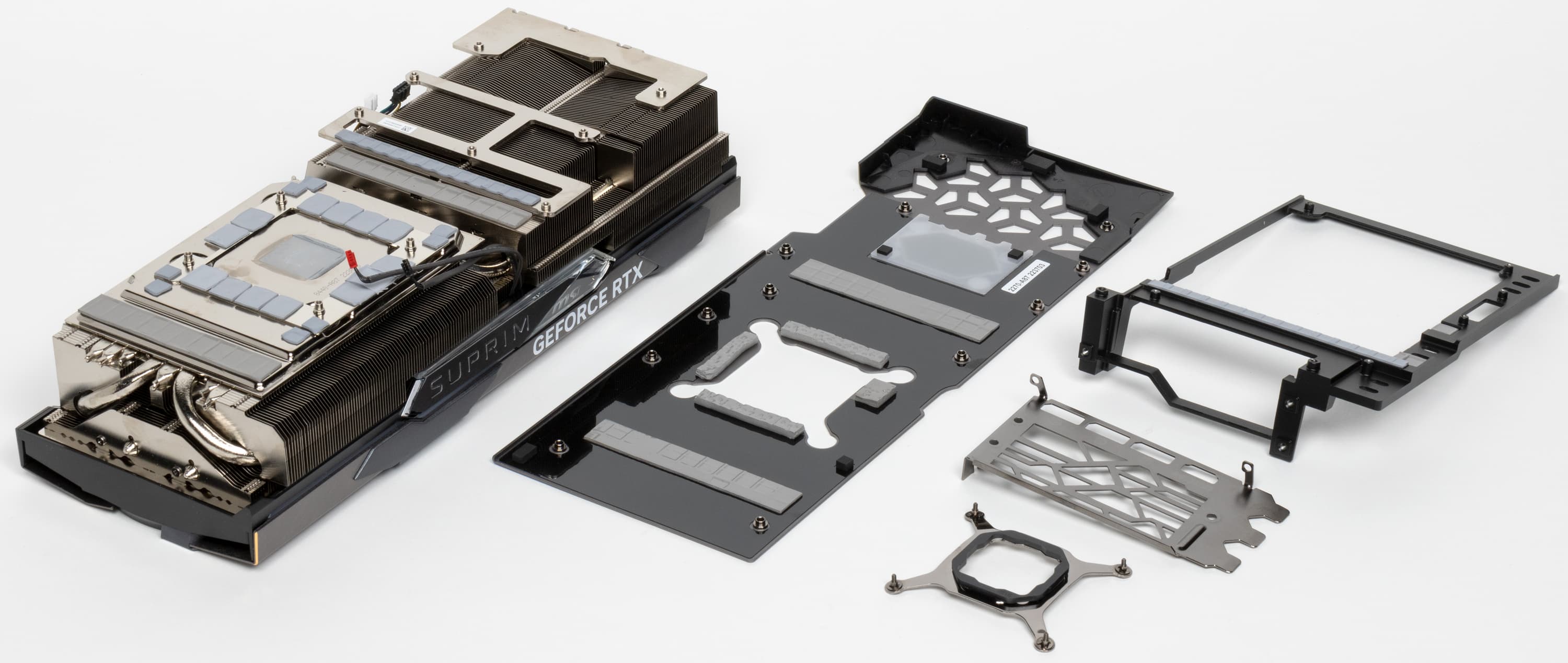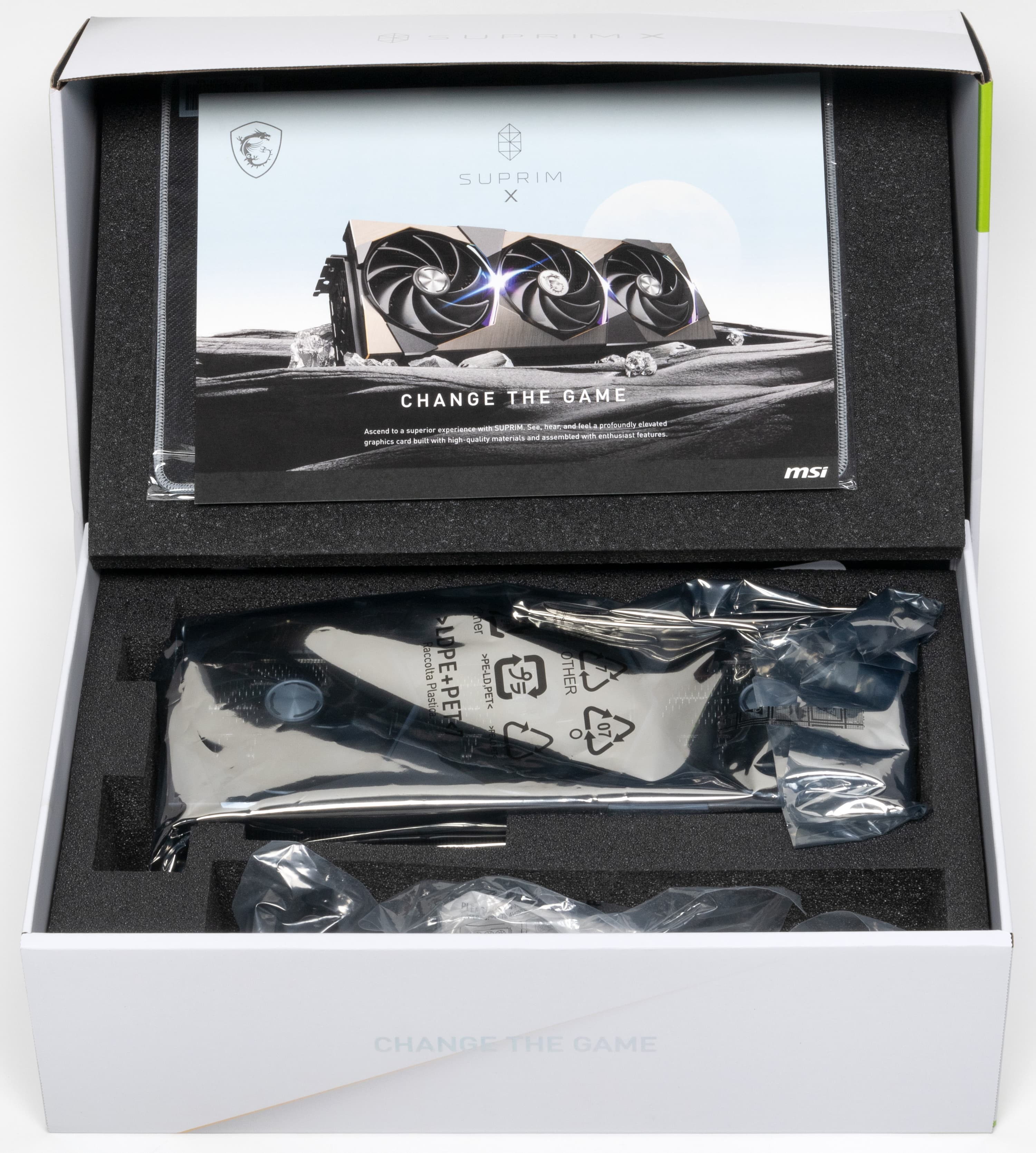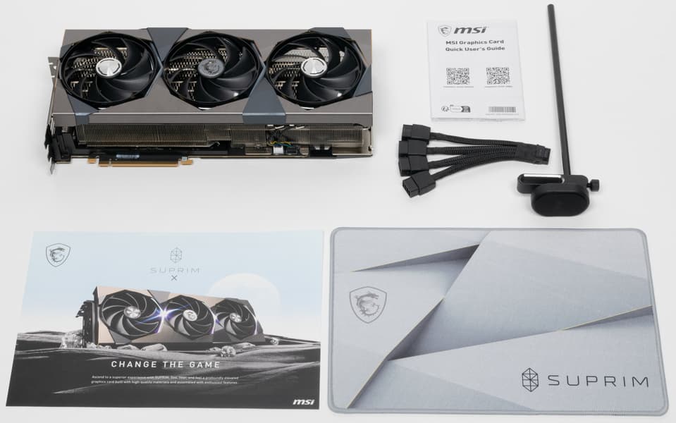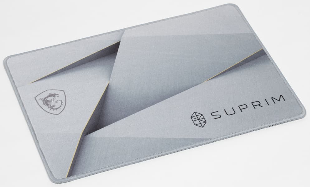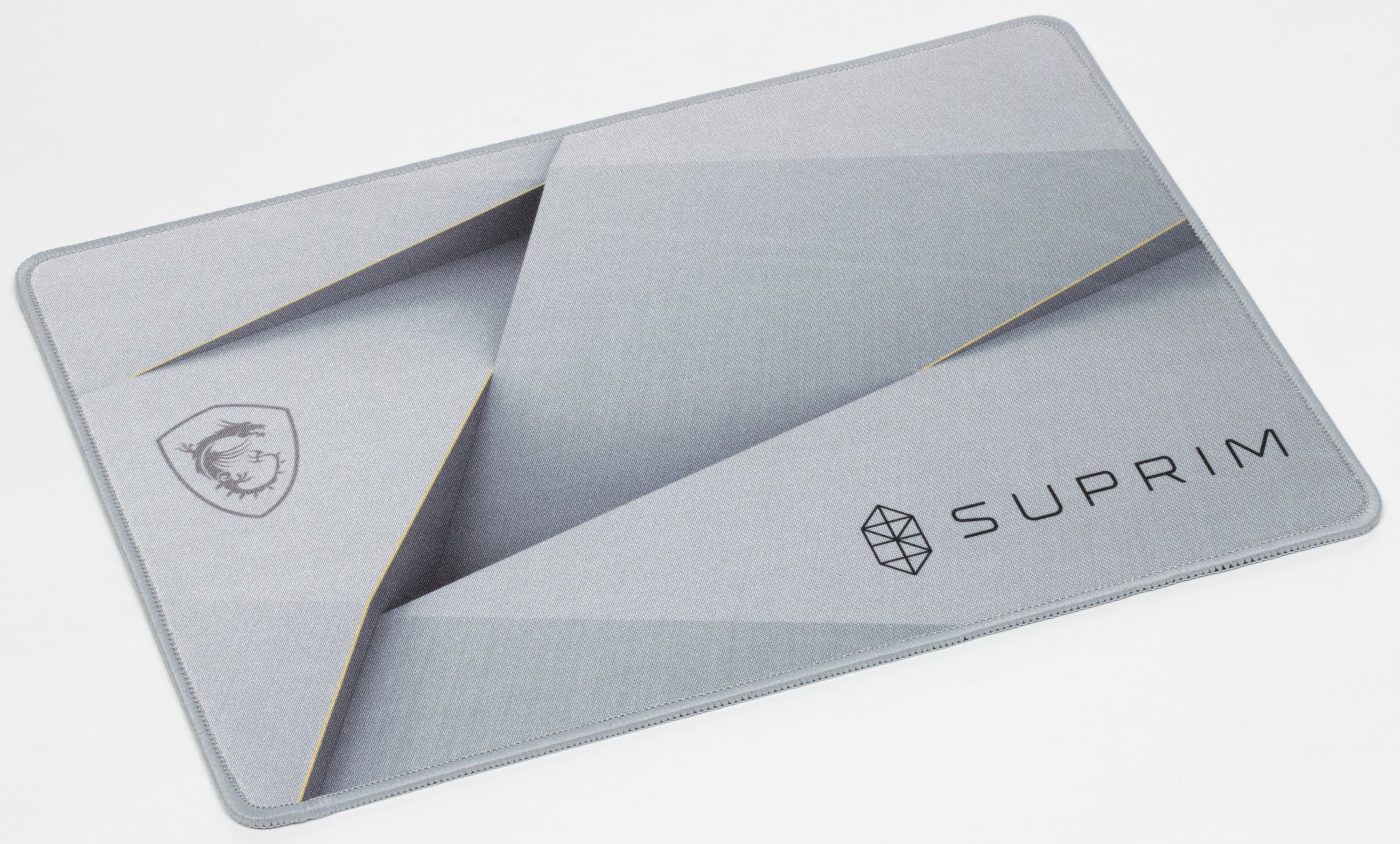 В комплекте поставки кроме традиционного краткого руководства пользователя имеются: металлическая подставка-кронштейн с надписью Suprim под карту, переходник питания и плотный прорезиненный коврик для игровой мыши с логотипами MSI и Suprim.