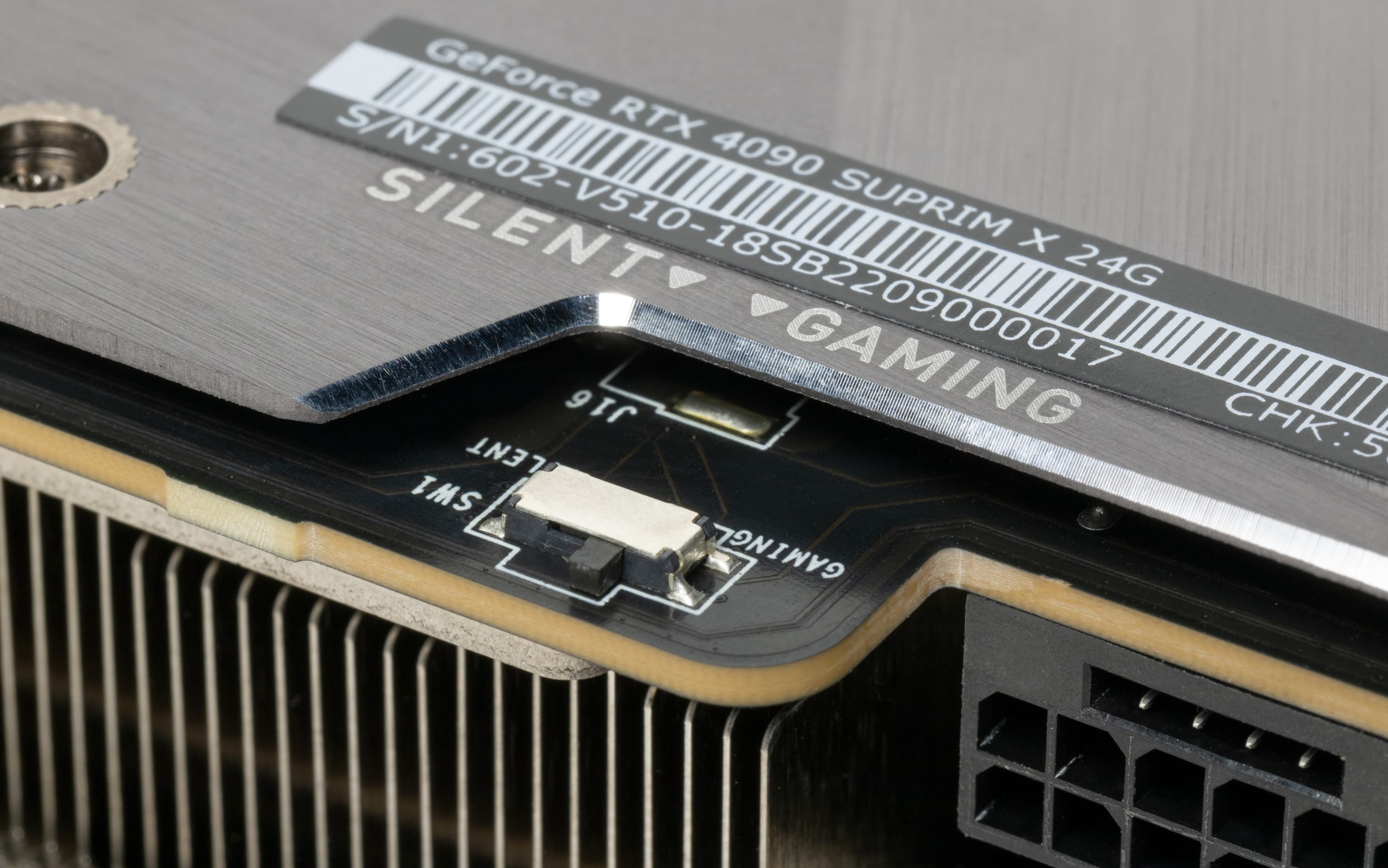 Карта имеет два режима работы, они заложены в двух вариантах BIOS, которые переключаются с помощью переключателя на верхнем торце карты: Gaming (с фабричным разгоном) и Silent (тихий, почти без фабричного разгона). Разница между режимами заключается не только в оборотах вентиляторов, также у GPU в этих режимах разные максимальные частоты. При этом предел энергопотребления для версии BIOS Gaming заложен в 480 Вт, а для BIOS Silent – 450 Вт.