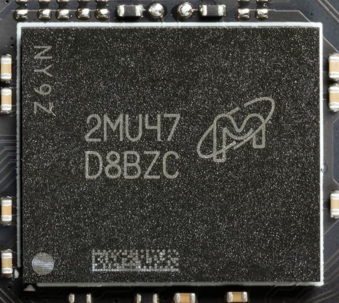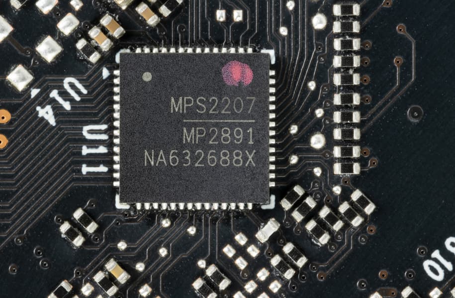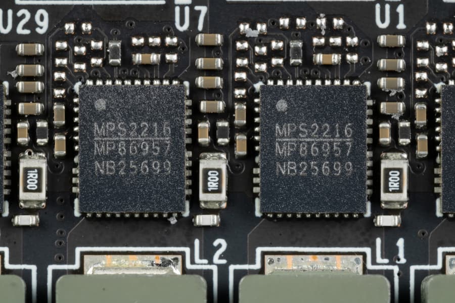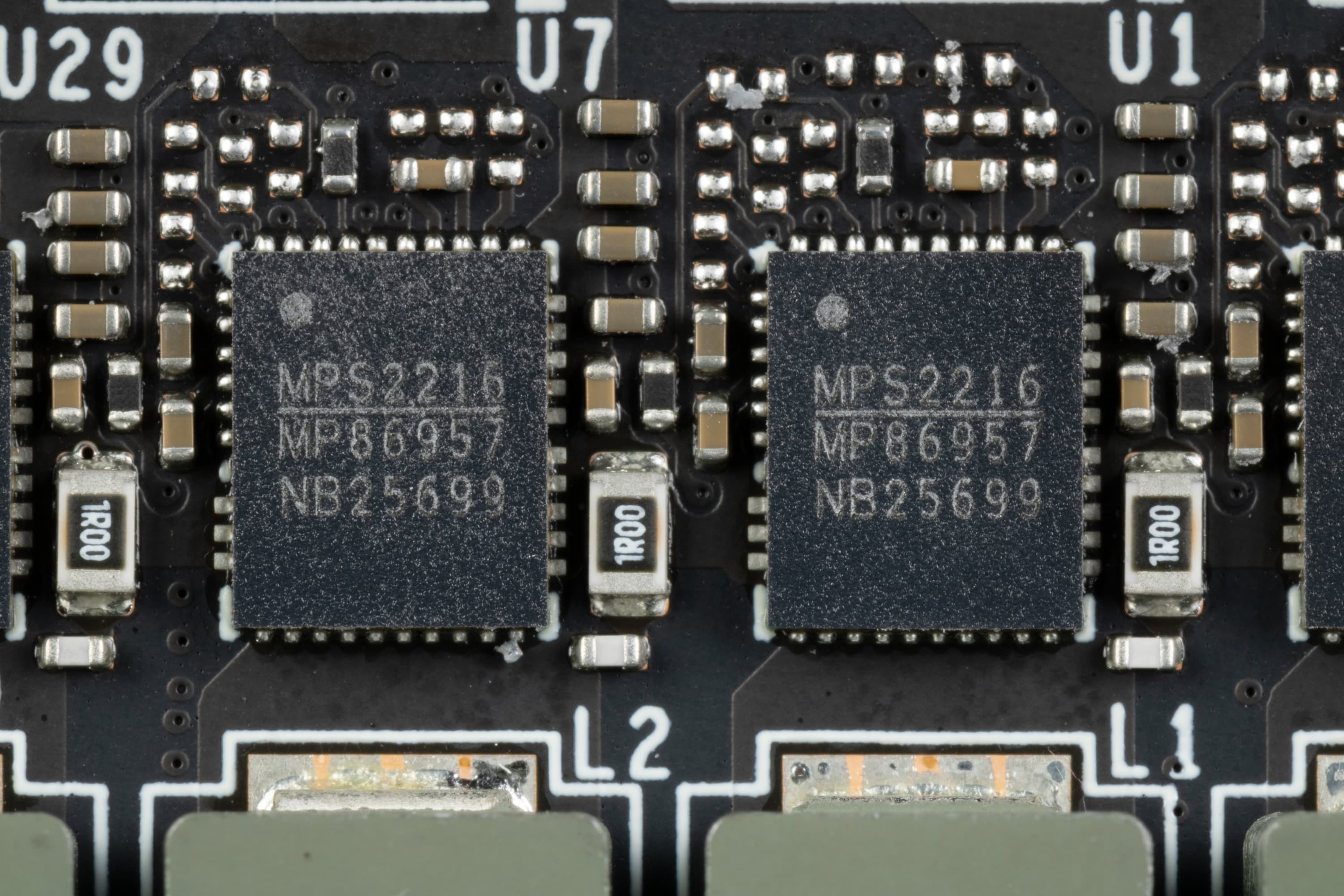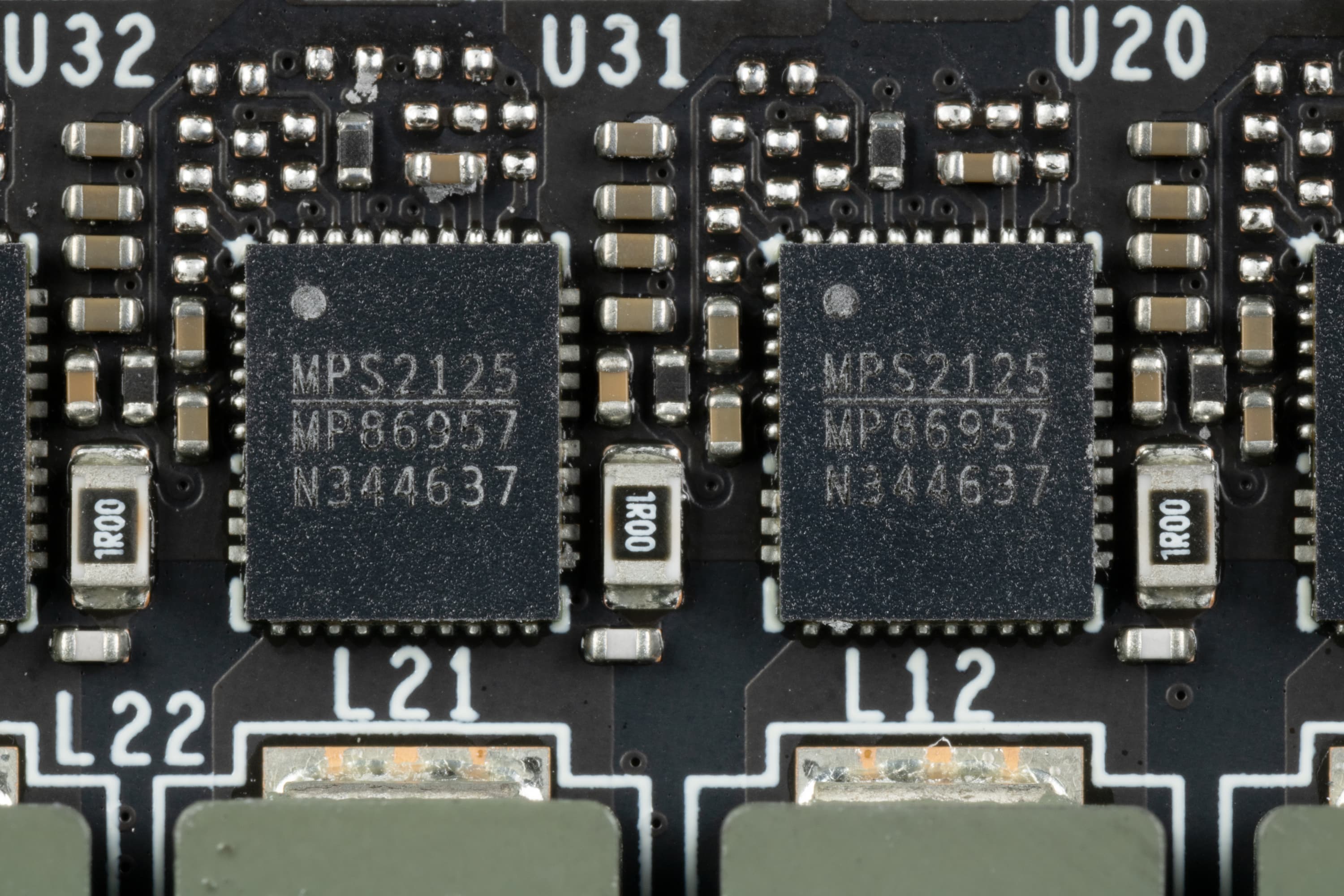 В преобразователе питания графического ядра используются транзисторные сборки DrMOS — в данном случае Monolithic Power Systems MP86957, каждая из которых рассчитана максимально на 70 А.