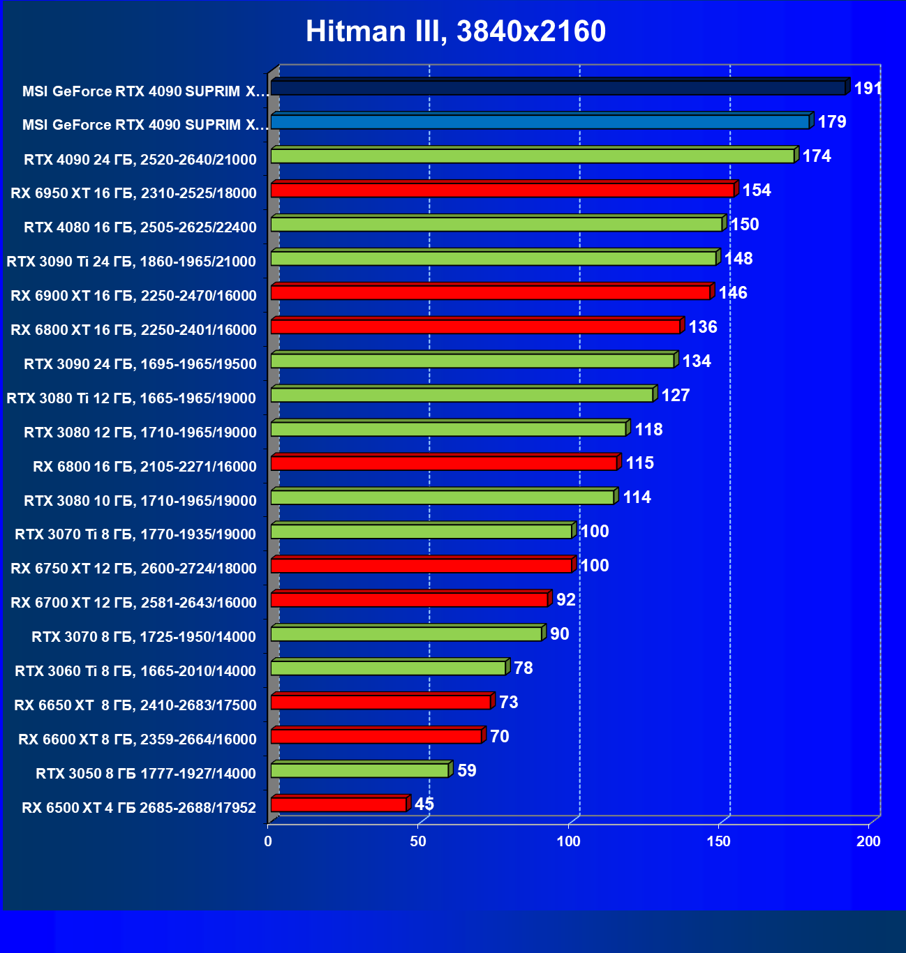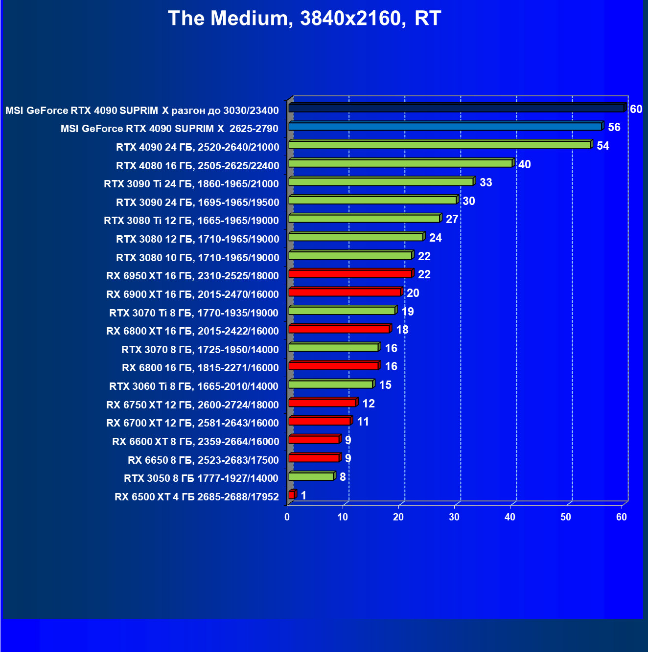 | 21 | MSI GeForce RTX 4090 Suprim X 24 ГБ, 2625—2790/21000 | 54 | 976 | 180 000 |