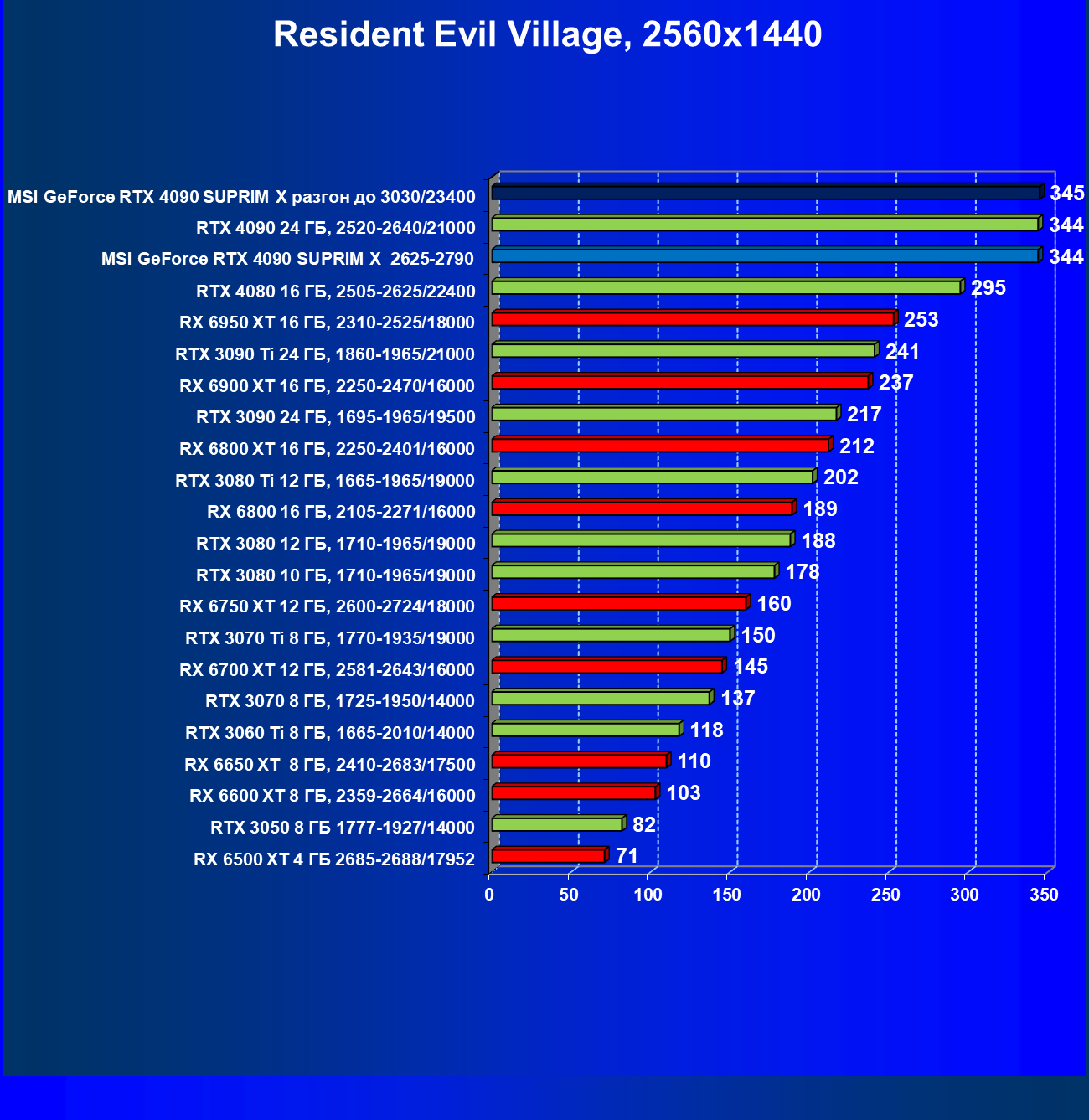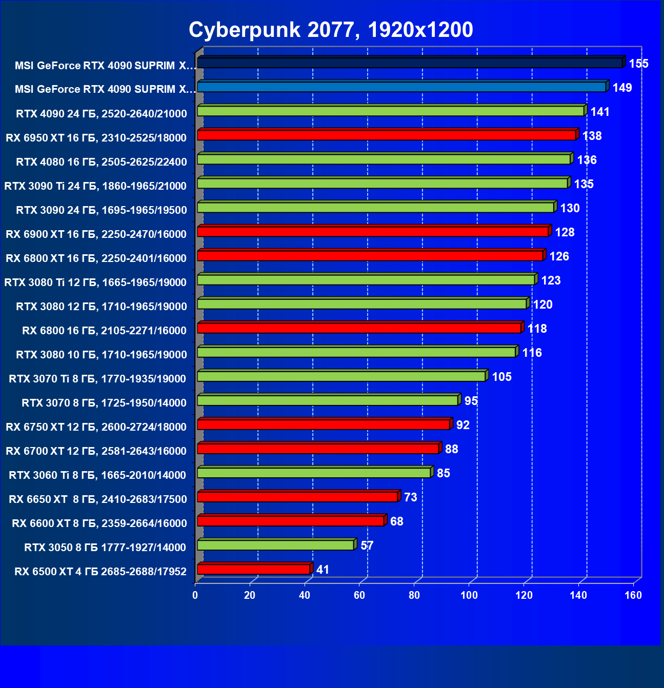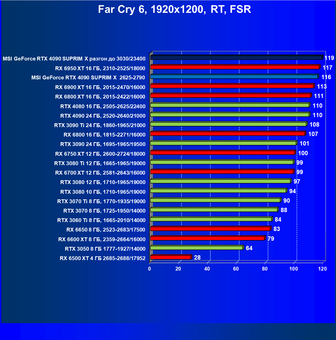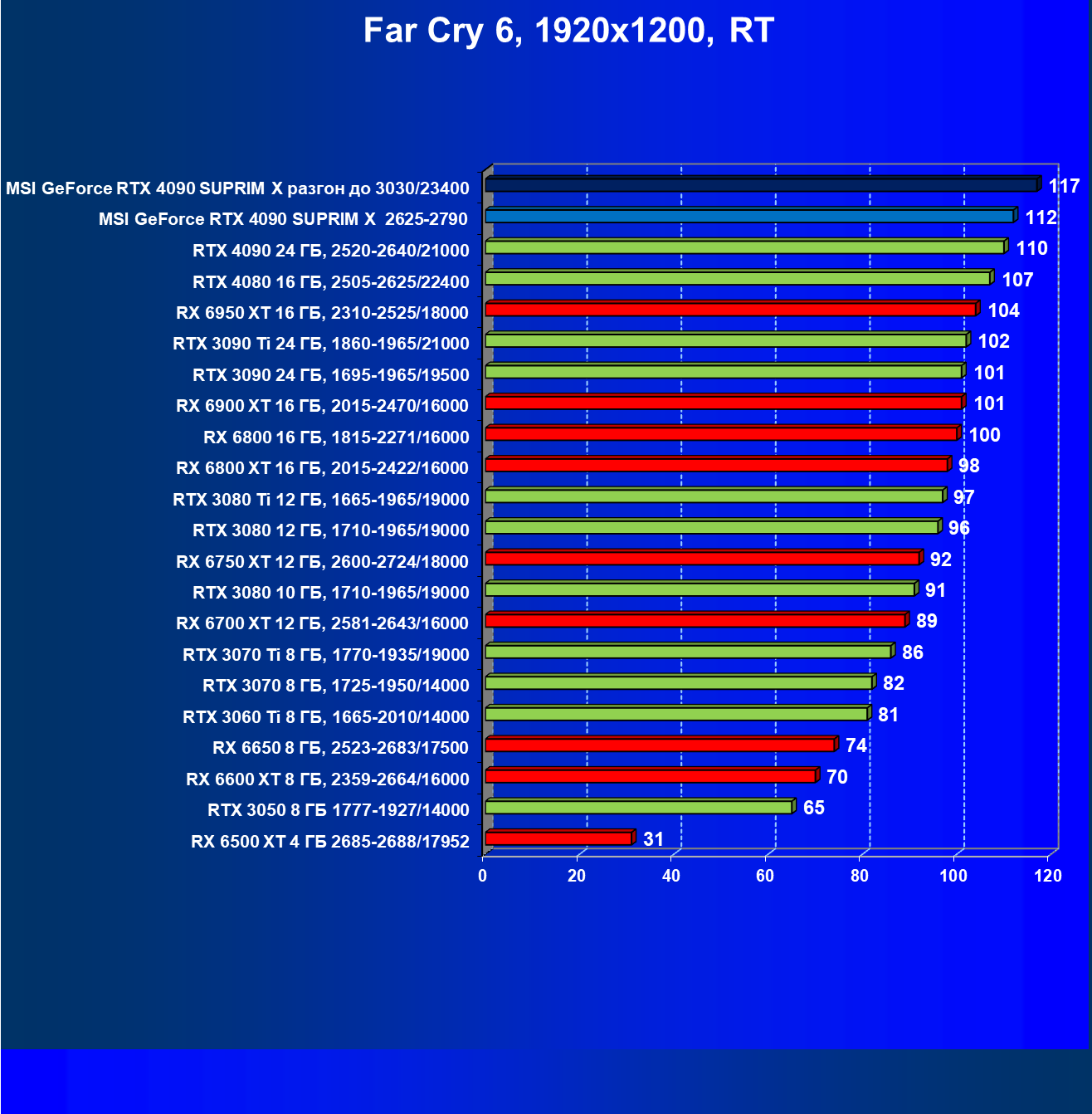 Лидерство RTX 4090 очевидно, средний прирост производительности относительно RTX 3090 Ti и RX 6950 XT по всем разрешениям составляет 28%, а с разгоном — вообще 32%. Карта MSI за счет фабричного разгона немного быстрее референс-карты. Следует учитывать, что мы взяли для таблицы минимальную стоимость RTX 4090, исходя из цен на маркетплейсах, и чаще всего это самый простой вариант, типа карты Colorful (RTX 4090 FE почти недоступна, а ее стоимость даже превышает стоимость рассматриваемой карты MSI).