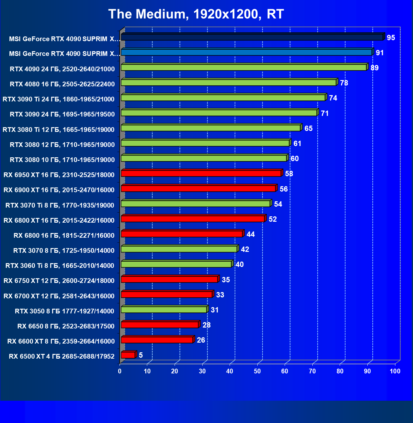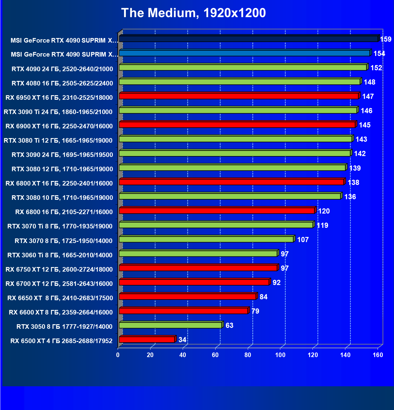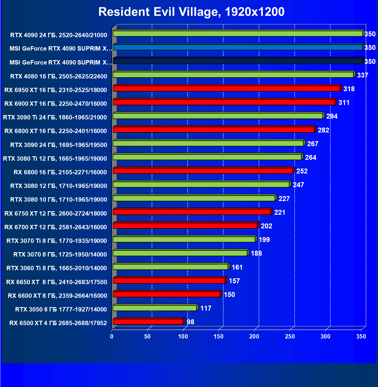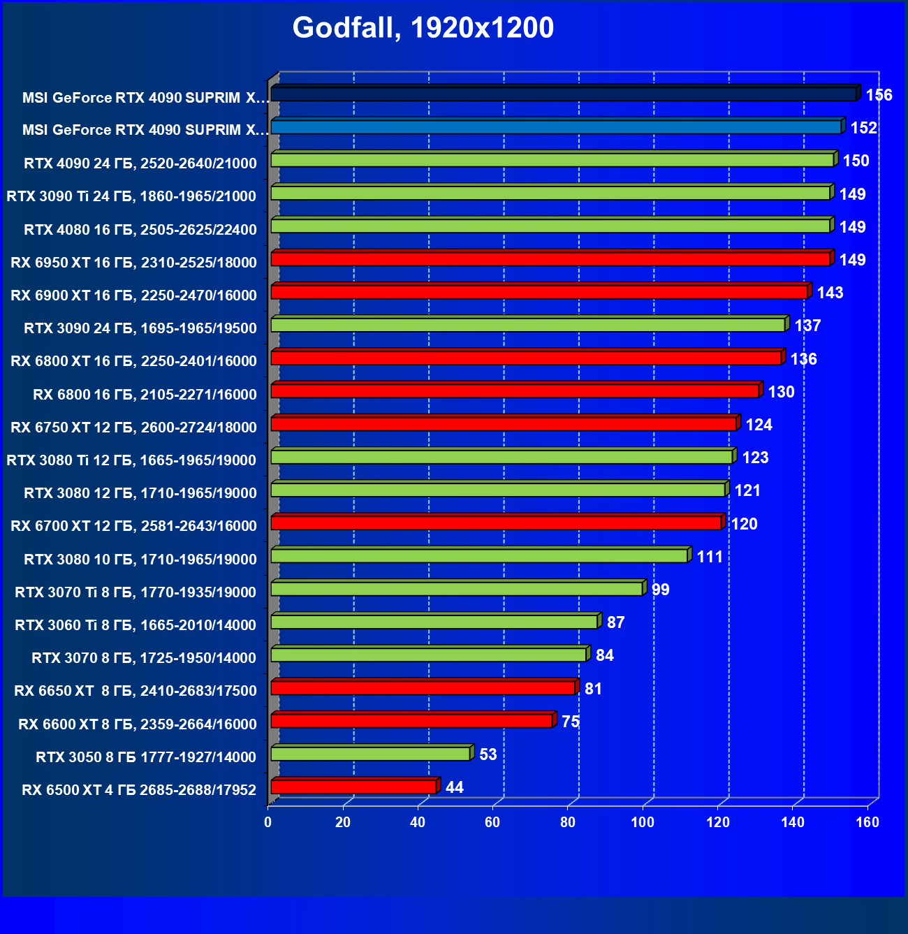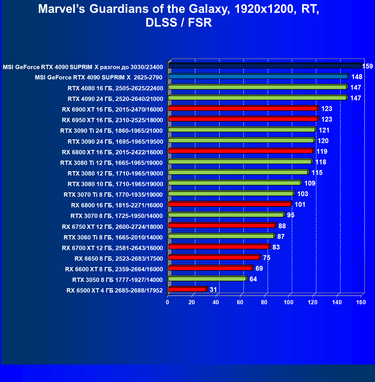 Лидерство RTX 4090 очевидно, средний прирост производительности относительно RTX 3090 Ti и RX 6950 XT по всем разрешениям составляет 28%, а с разгоном — вообще 32%. Карта MSI за счет фабричного разгона немного быстрее референс-карты. Следует учитывать, что мы взяли для таблицы минимальную стоимость RTX 4090, исходя из цен на маркетплейсах, и чаще всего это самый простой вариант, типа карты Colorful (RTX 4090 FE почти недоступна, а ее стоимость даже превышает стоимость рассматриваемой карты MSI).