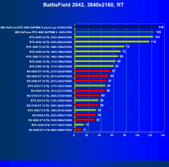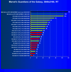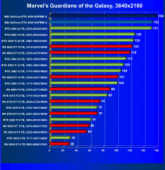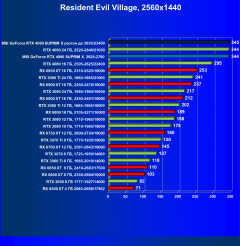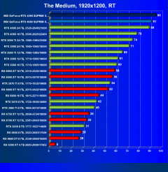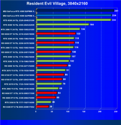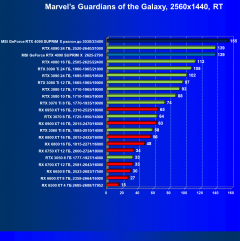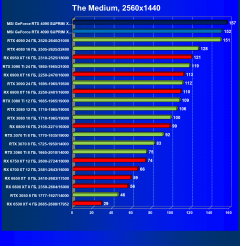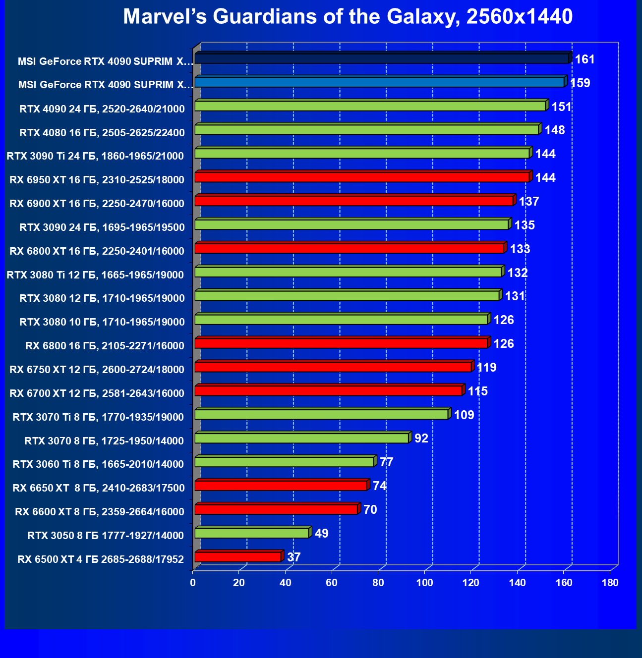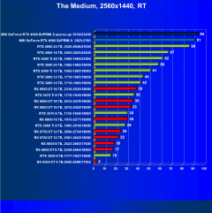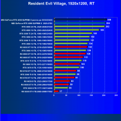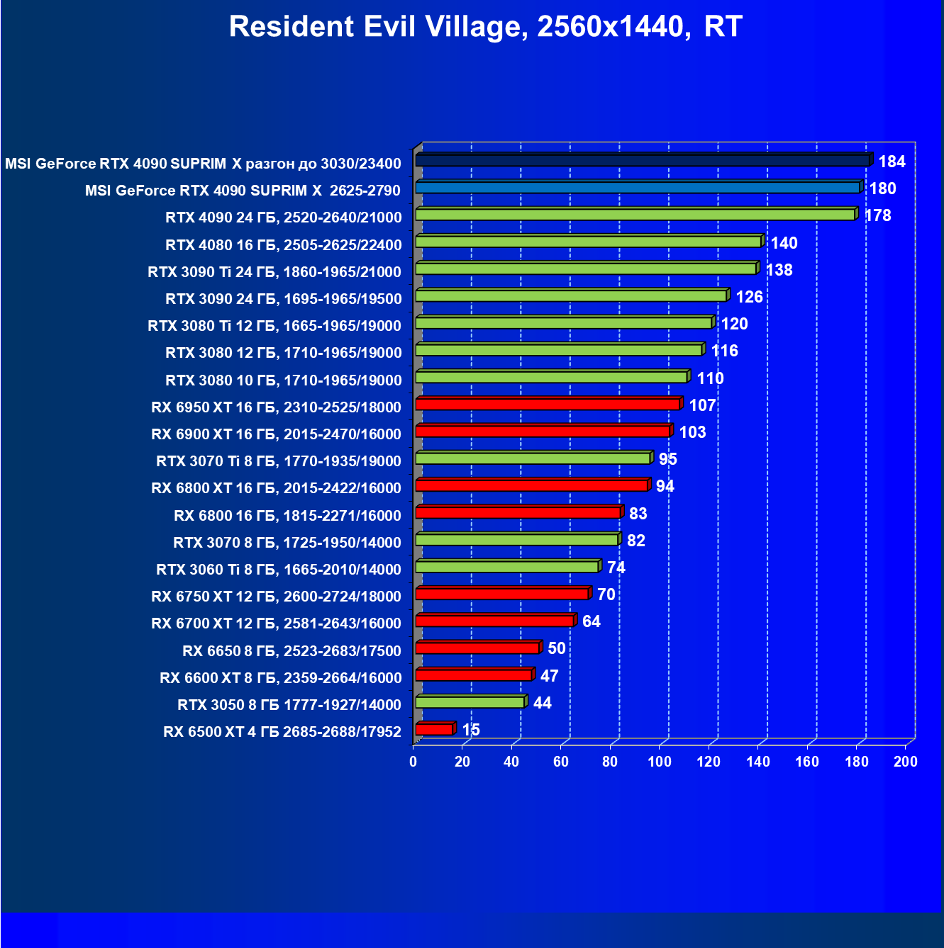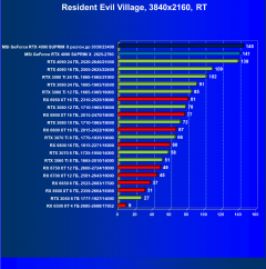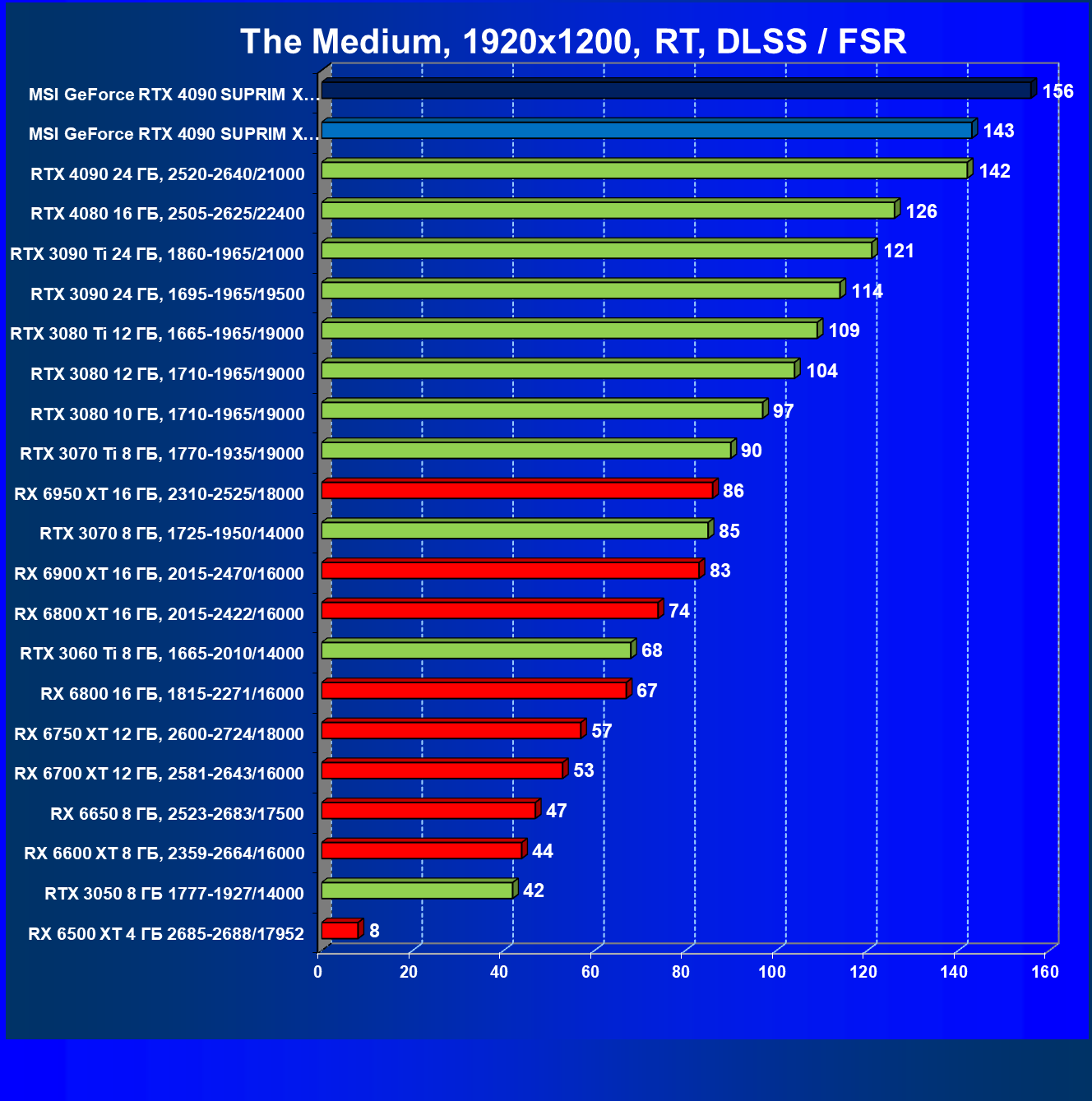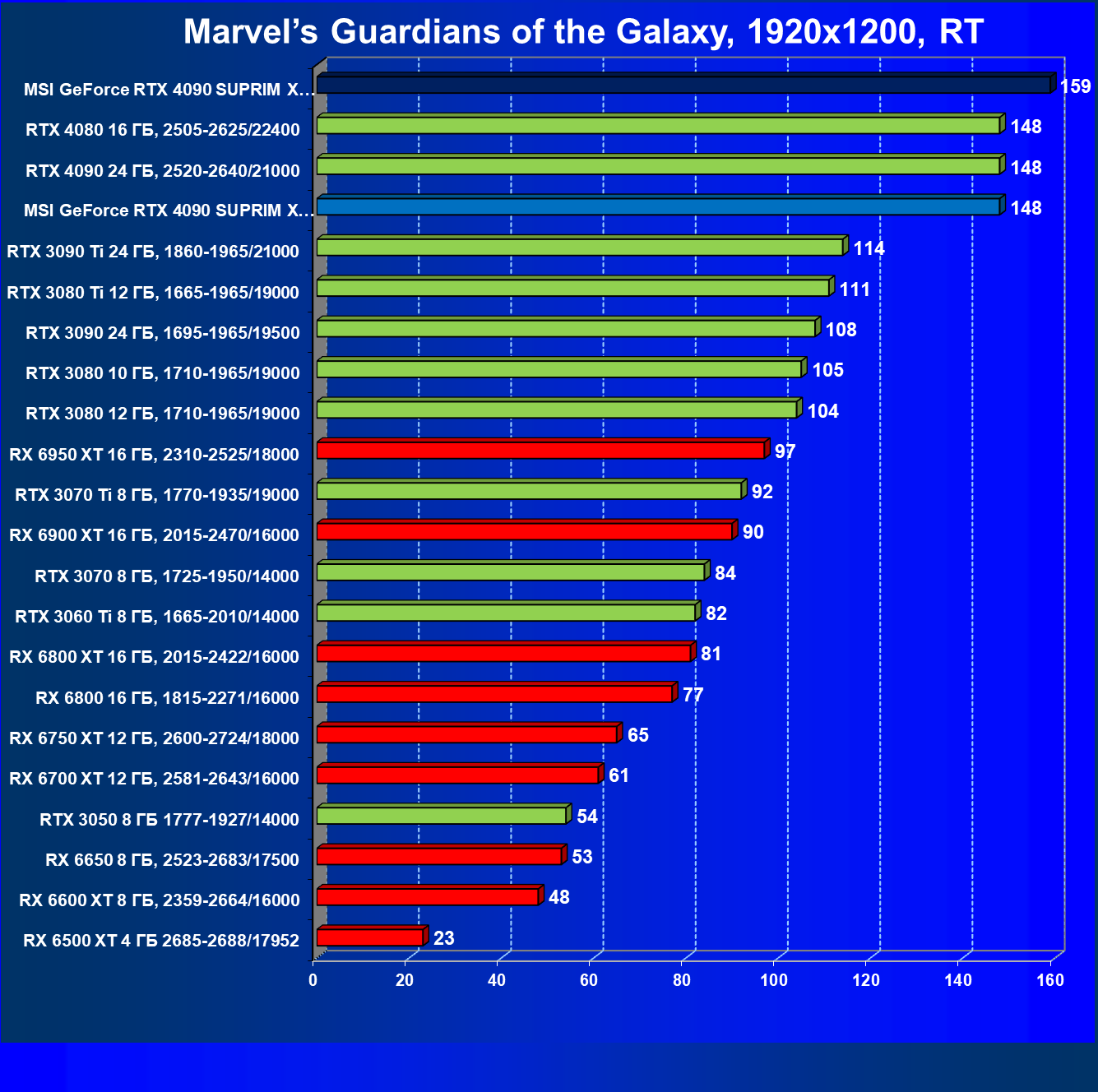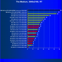 В данном случае превосходство RTX 4090 относительно флагманов AMD выражено еще более ярко вследствие большего падения производительности у тех при включении RT: разница с RX 6950 XT в данном случае составляет 51% по всем разрешениям. Карта MSI за счет фабричного разгона опять же немного быстрее референсной модели.
